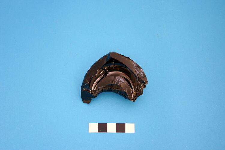One dark green glass beer or wine bottle base fragment. Was manufactured in a vented mould with a separate base plate, suggesting it was made after circa 1874 but before circa 1900.