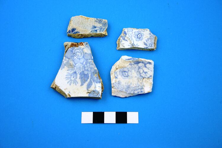 Four earthenware fragments probably from plates. Transfer print is blue 'Asiatic Pheasants', popular in the second half of the 19th century and into Edwardian times.