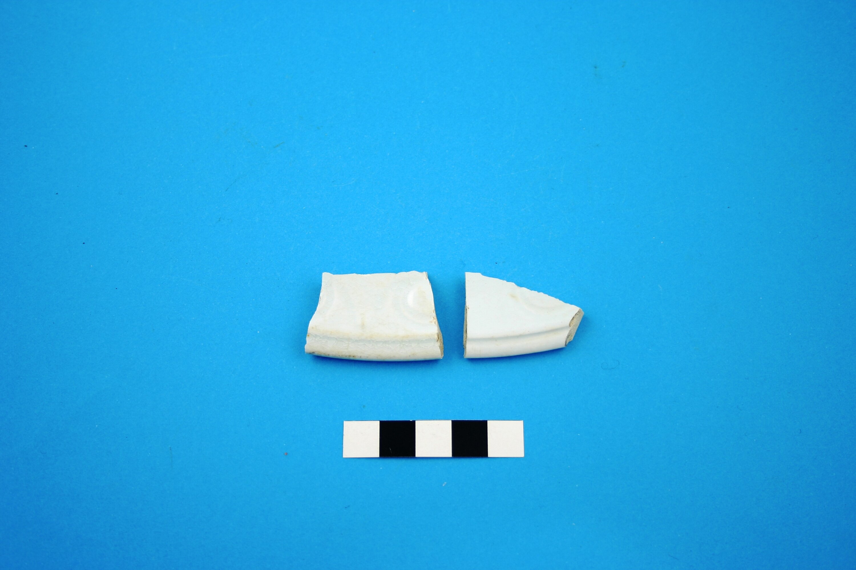 Two high fired earthenware plate rim fragments from two separate items. Decorated with an unidentified moulded design that is typical of 'White Granite'. Manufactured between the 1840s and circa 1930.