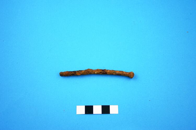 One complete wire iron alloy nail. Head type cannot be determined due to rust and encrustation but appears to be flat. The end is 'chisel' shaped. Manufacturing period is from the 1850s.