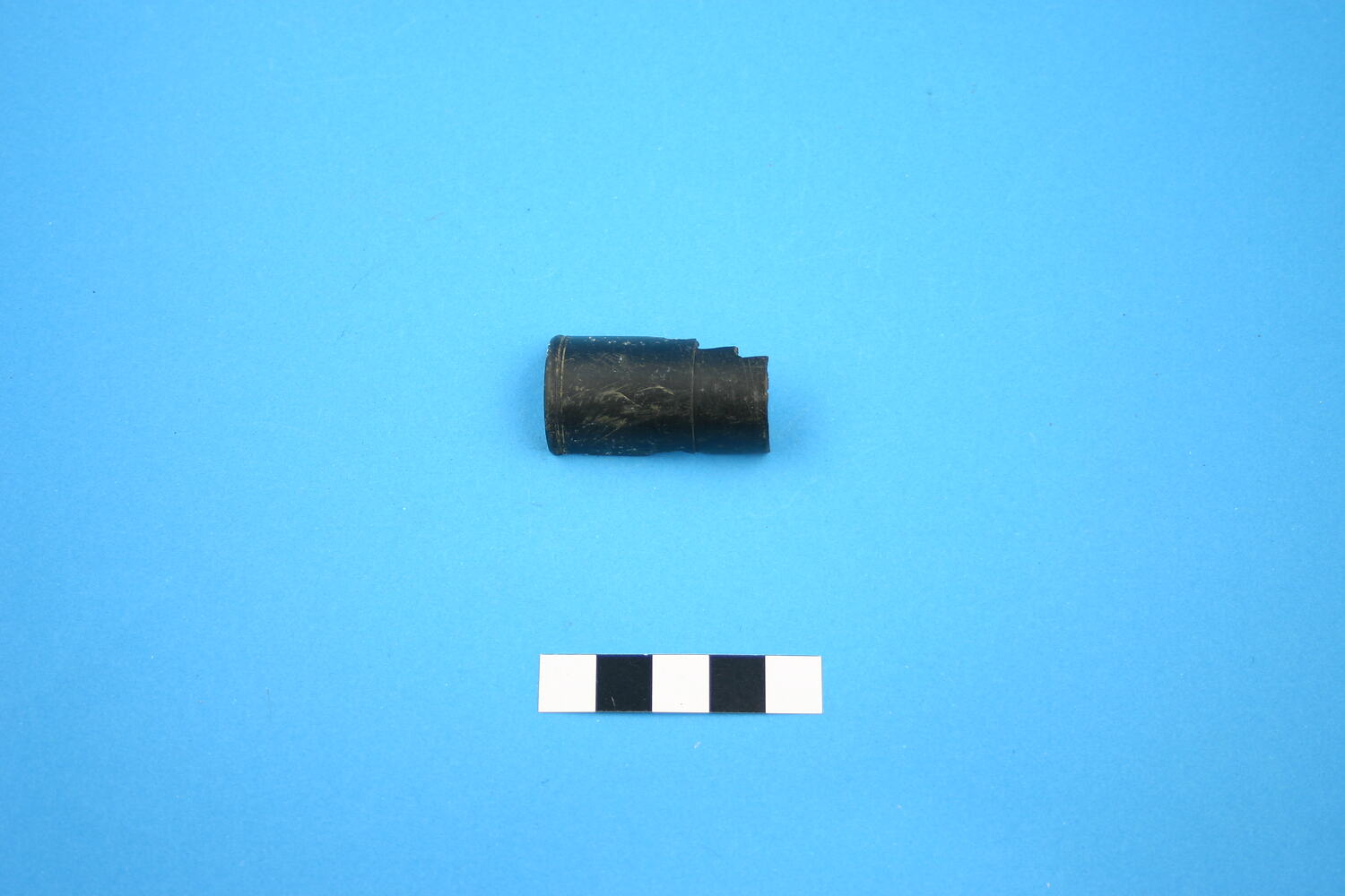 One fragment of a tubular black plastic item. Manufactured after 1907.