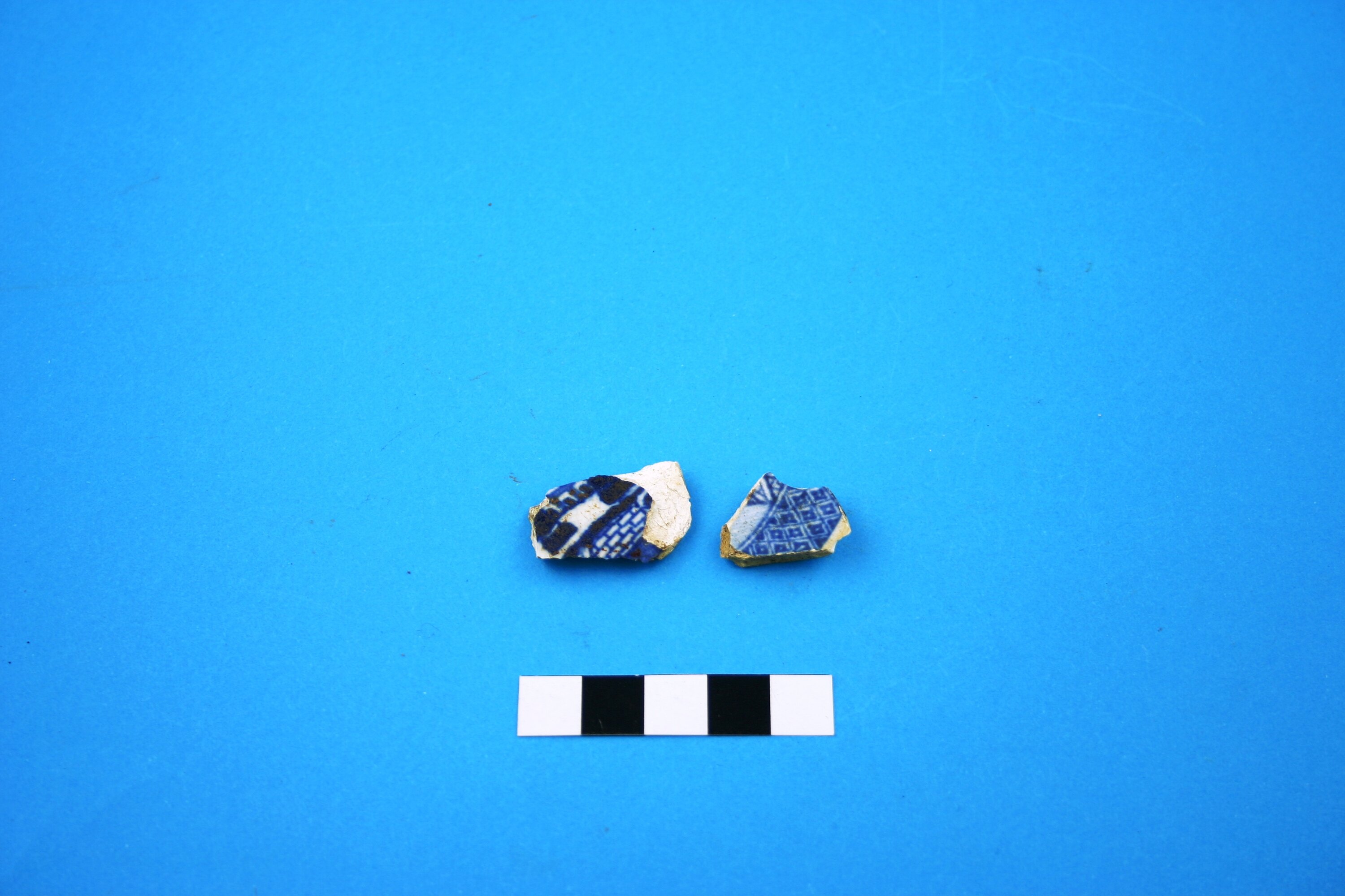 Two earthenware fragments from unidentified items. Pattern is blue transfer print 'Willow'. Manufacturing date range is circa 1805 to circa 1900.