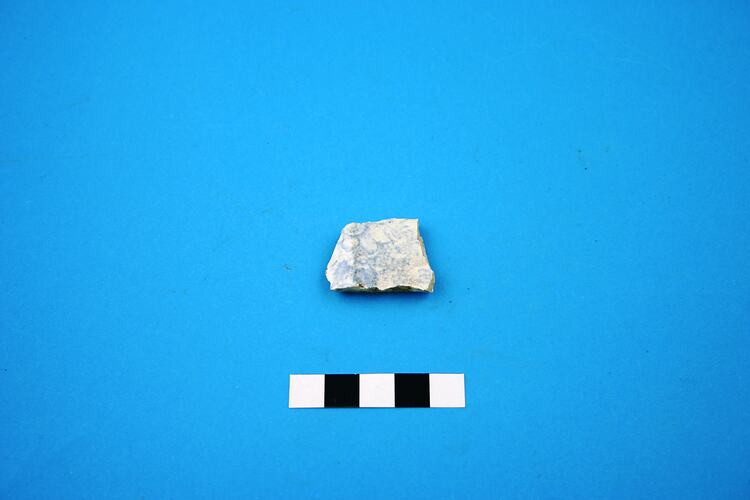 One earthenware plate fragment. Transfer print is blue 'Asiatic Pheasants', popular in the second half of the 19th century and into Edwardian times.