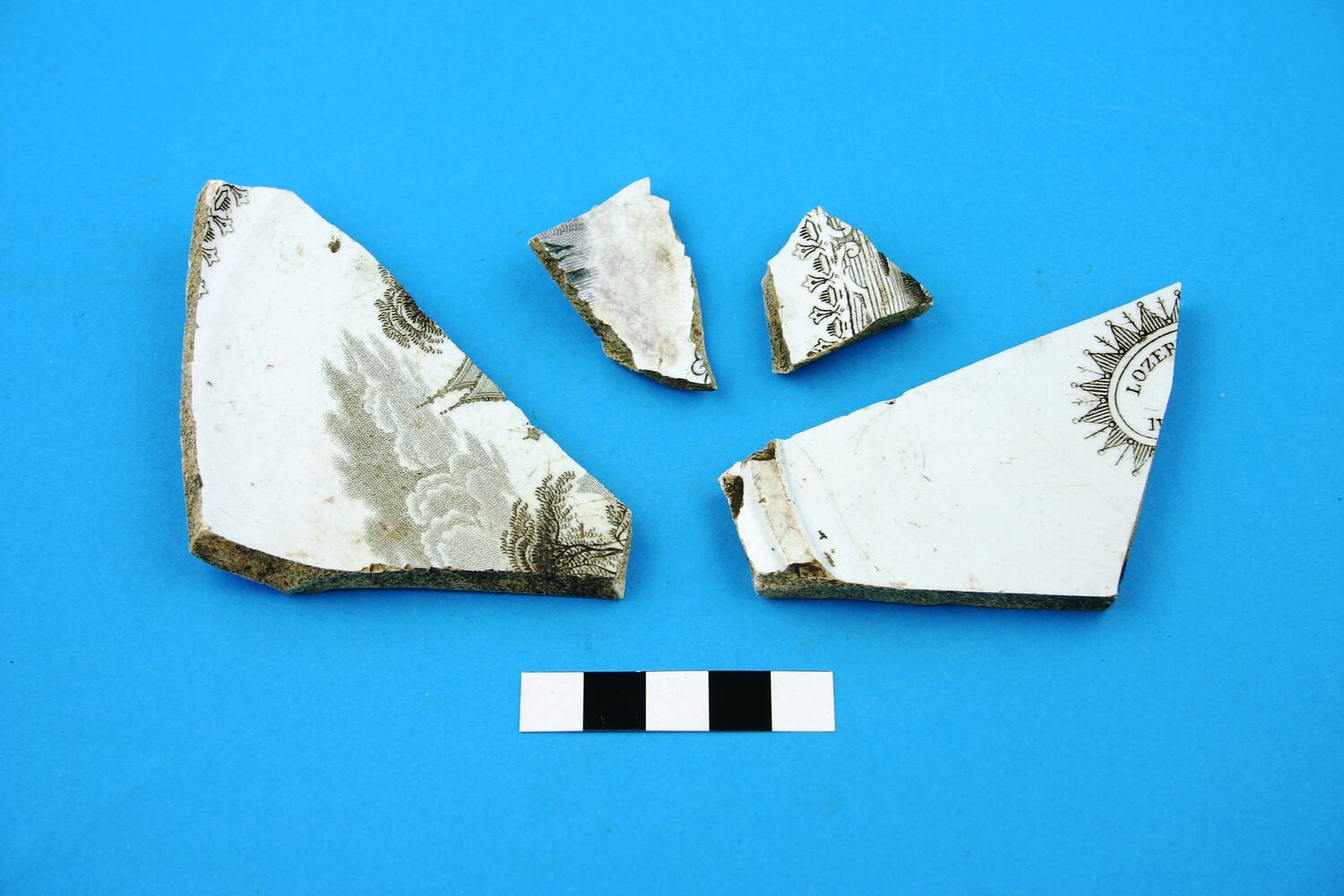 Four partially conjoining fragments of an earthenware plate base. Decoration is brown transfer print in Lozere pattern. Partial maker's mark includes the pattern name and 'Ironstone'. Manufactured by Edward Challinor, Staffodshire, England, 1862 to 1867.