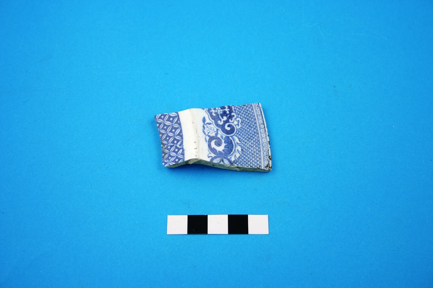 One earthenware plate rim fragment. Pattern is blue transfer print 'Willow'. Manufacturing date range is circa 1805 to circa 1900.