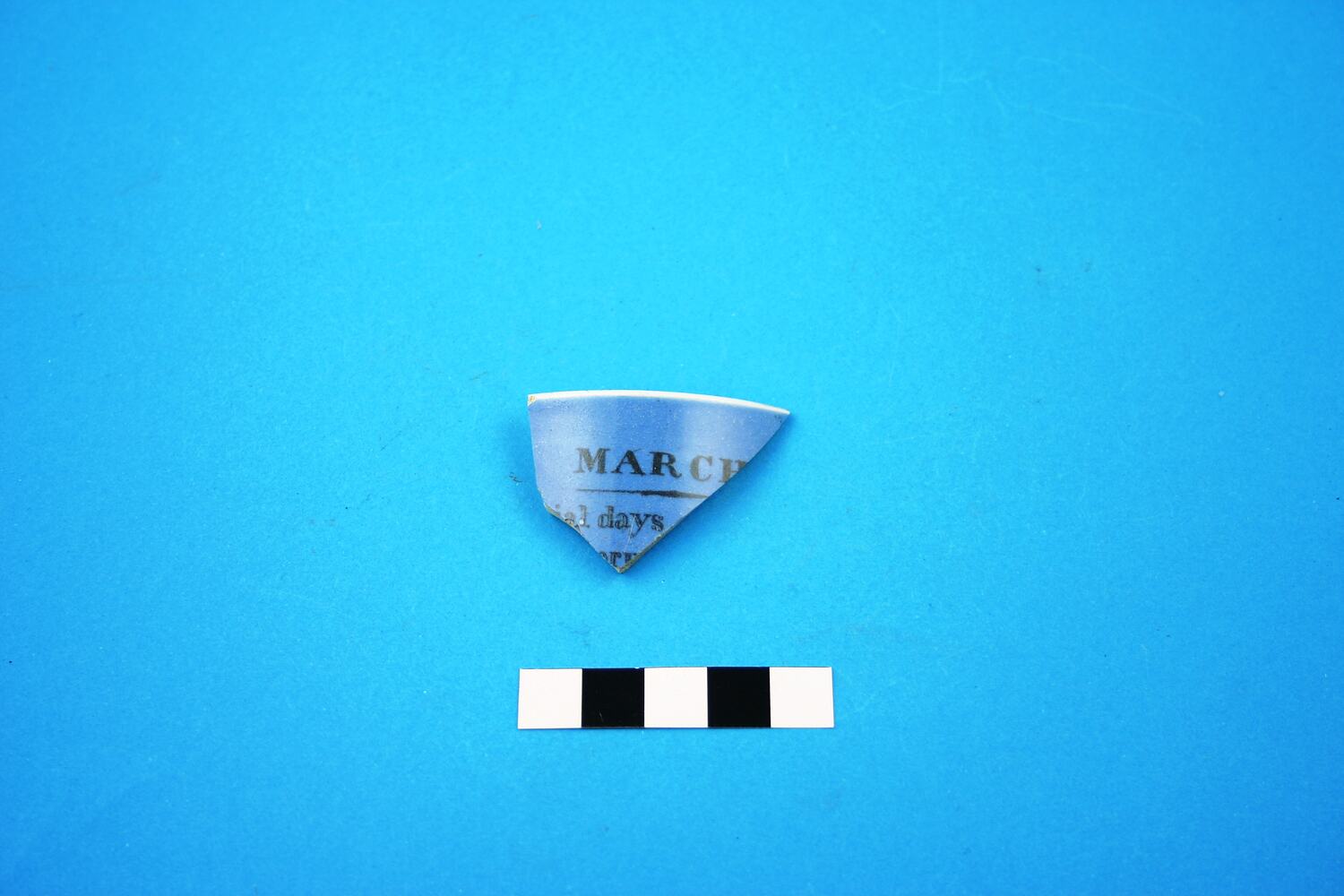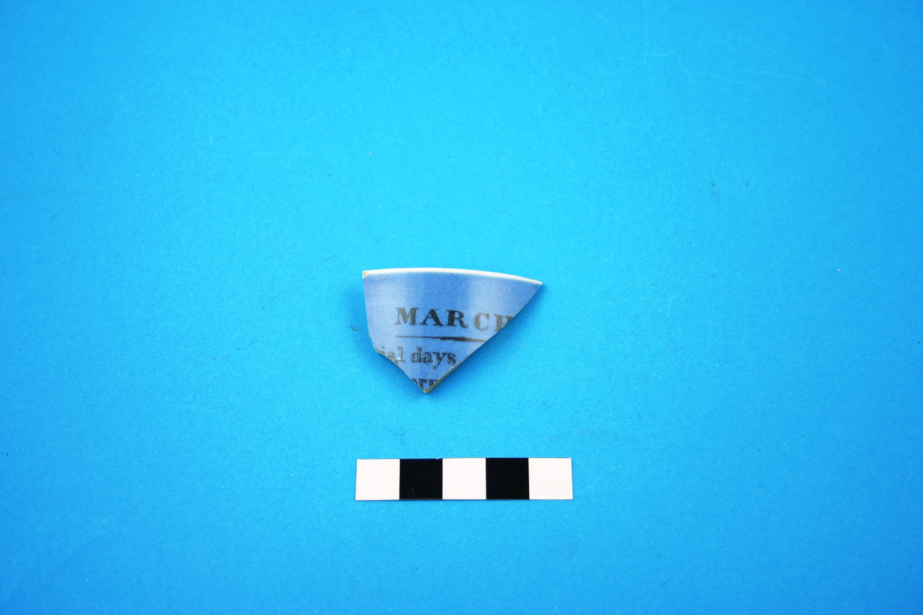One rim fragment of a mug with white glaze on the rim and interior and blue glaze on the exterior. The item has a transfer printed geometric patterned band on the inside rim and text on the outside 'MARCH.', '.ial days'.