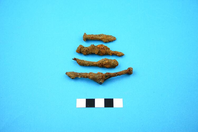 Four almost complete wire iron alloy nails. Head type cannot be determined due to rust and encrustation. Manufacturing period is from the 1850s.