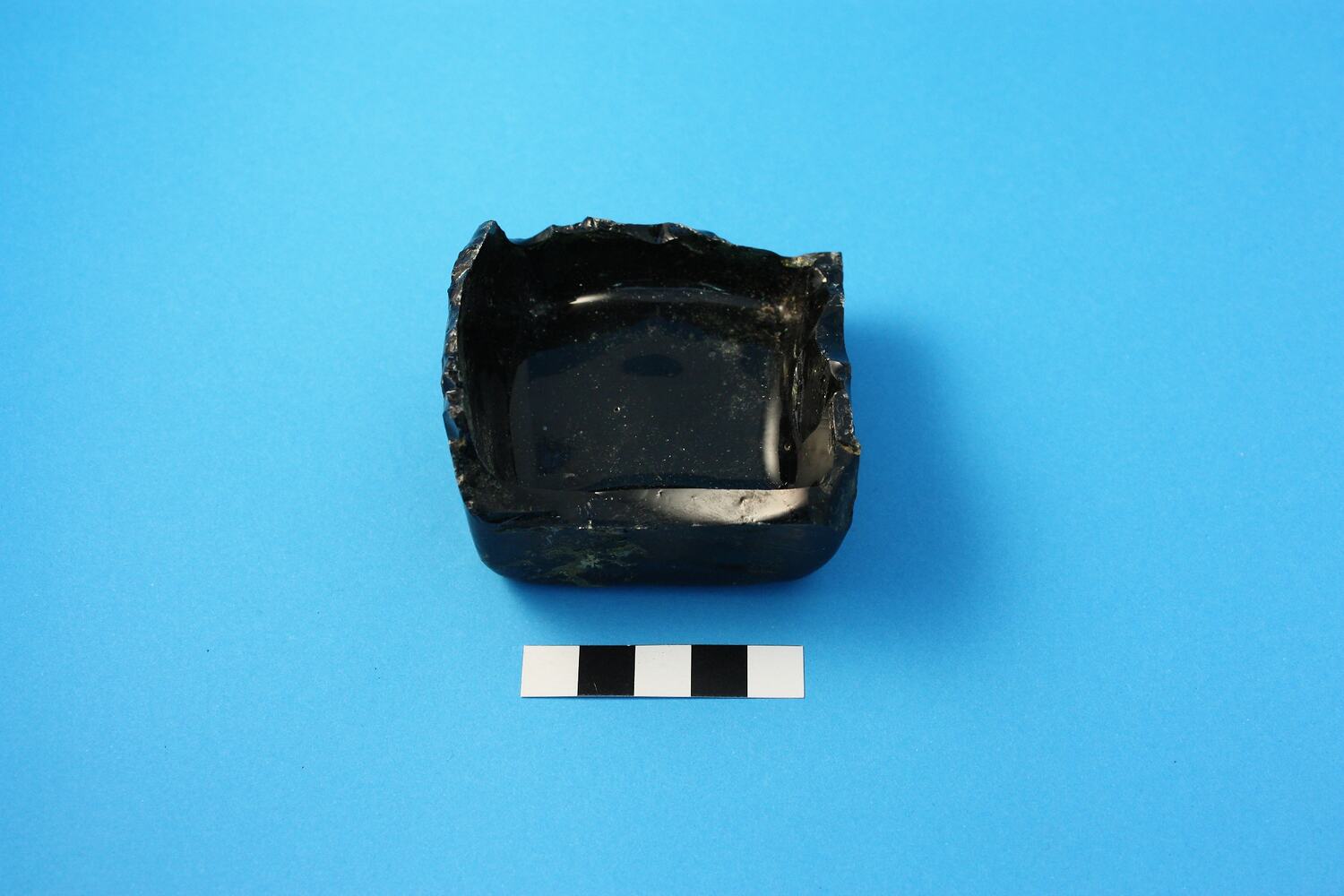 One dark green glass case bottle base. The base is square with rounded corners and a four-point resting surface and has an indented circular scar in the centre.