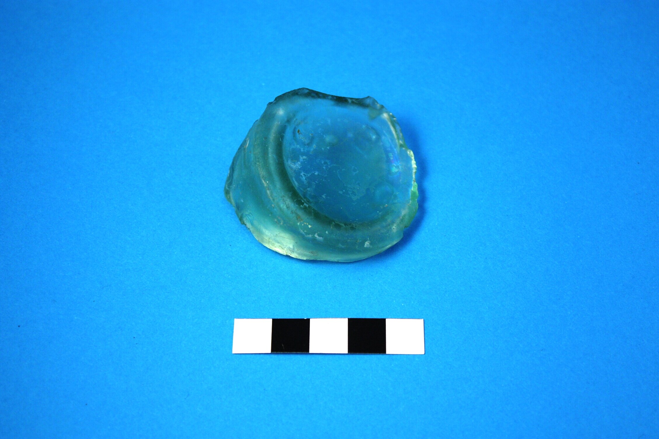 One light green glass bottle base fragment that has been manufactured in a mould that had a separate base plate. Maker's maker on the base: 'A C B Co'. Manufactured by Aire and Calder Glass Bottle Co of Yorkshire (1836 & 1913). Broad manufacture date range of mid-19th century to circa 1900.
