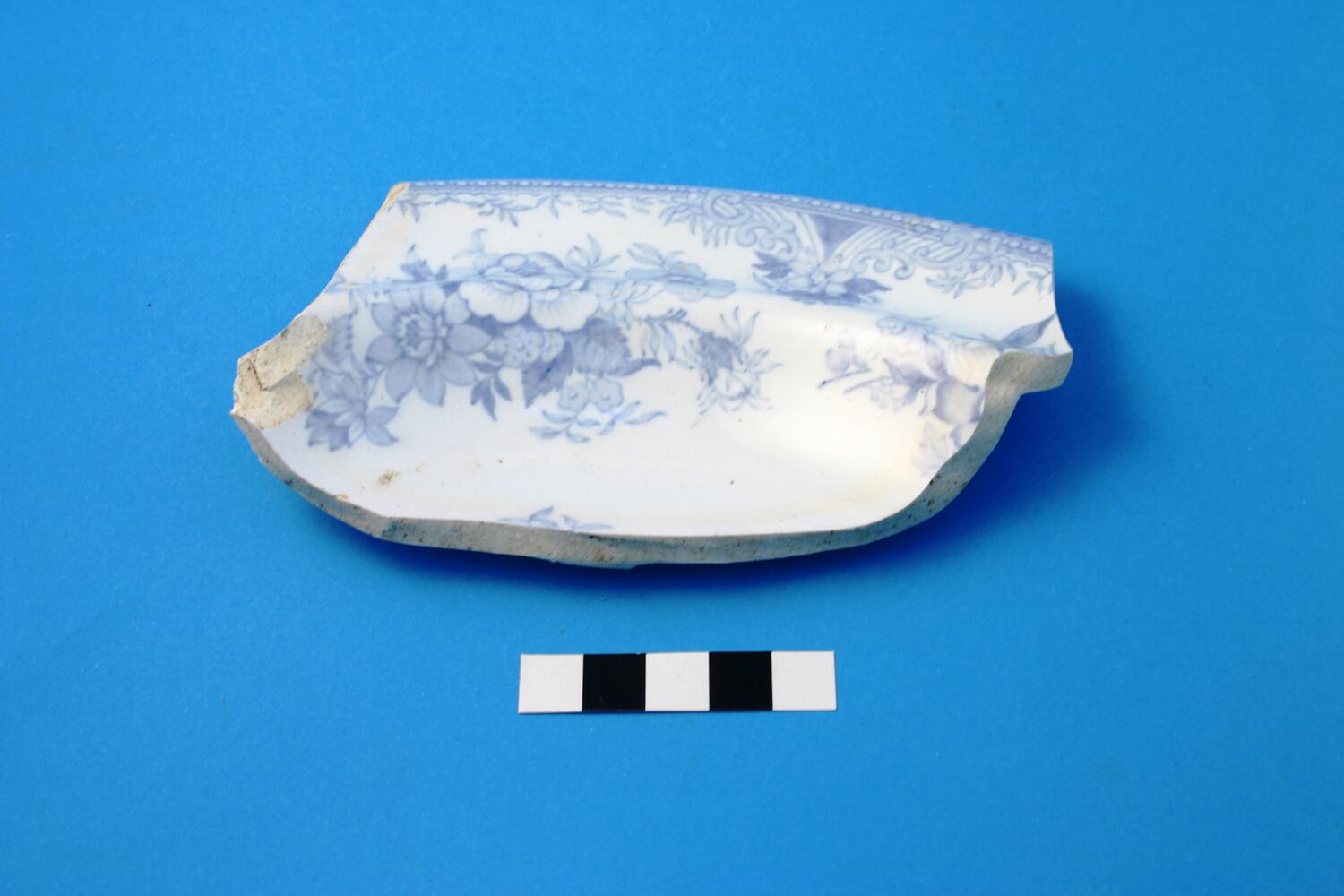 One large earthenware rim fragment possibly from a shallow footed comport. Transfer print is blue 'Asiatic Pheasants', popular in the second half of the 19th century and into Edwardian times.