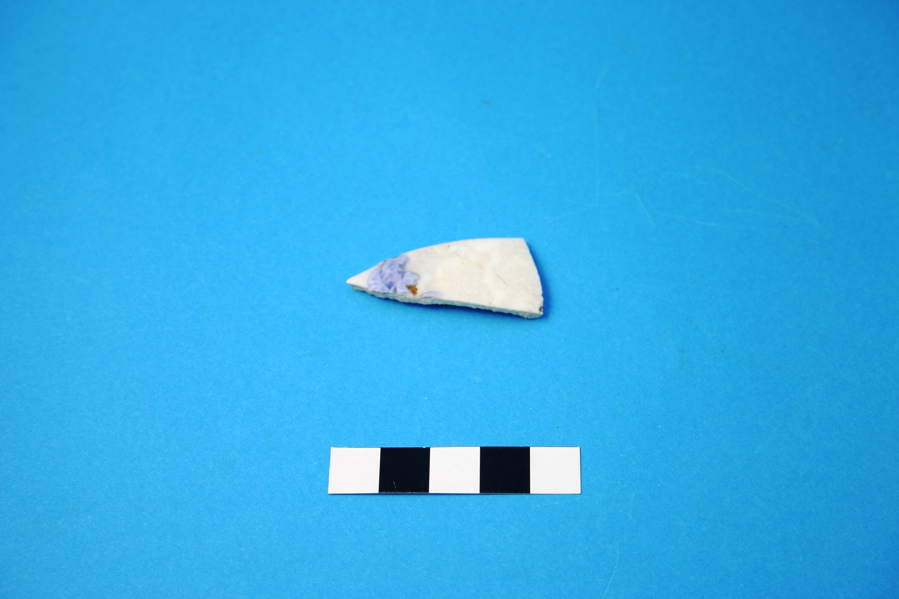 One porcelain cup fragment. The decoration is light blue applied sprig in a grapevine pattern. The manufacture date range is circa 1820 to the late 19th century.