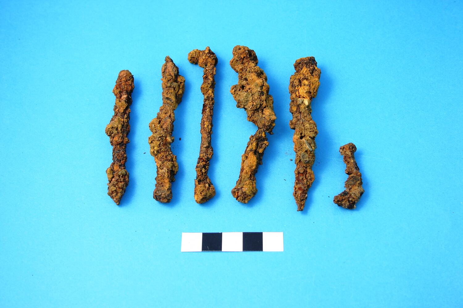Seven almost complete wire iron alloy nails. Head type cannot be determined due to rust and encrustation. Manufacturing period is from the 1850s.