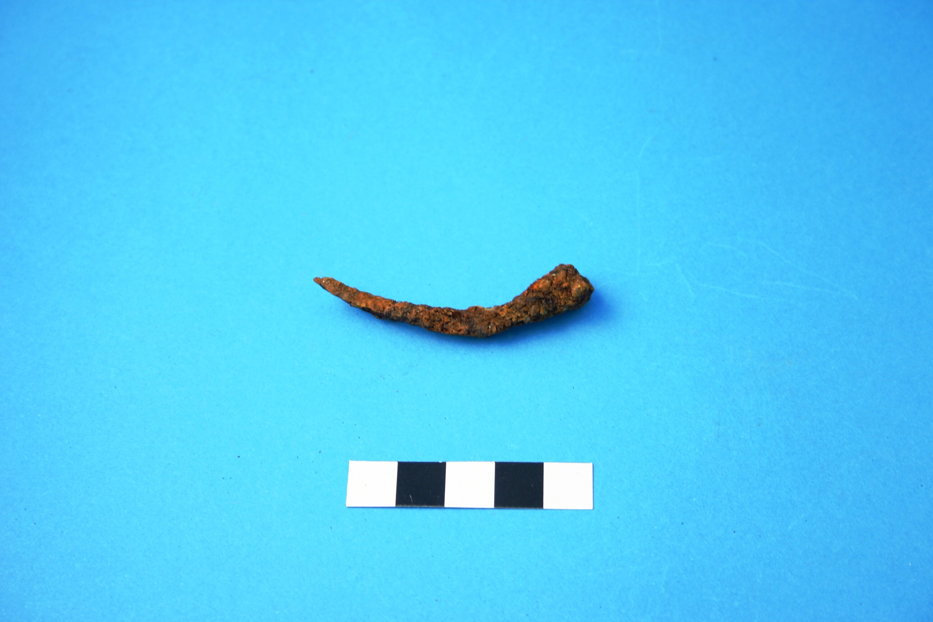 One almost complete cut iron alloy nail. Precise head type cannot be determined due to rust and encrustation. Manufacturing period is from circa 1805.