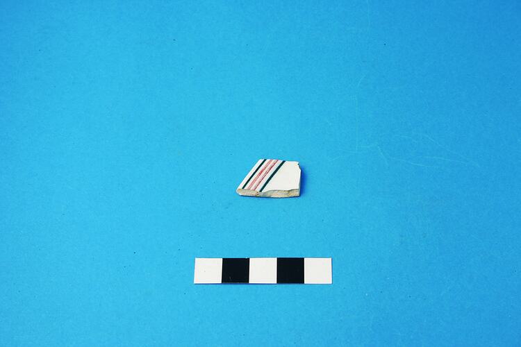 One earthenware rim fragment probably from a saucer. Decoration is hand painted under glaze bands in red and green (two thin red bands with a thin green band on either side). Made after circa 1805.