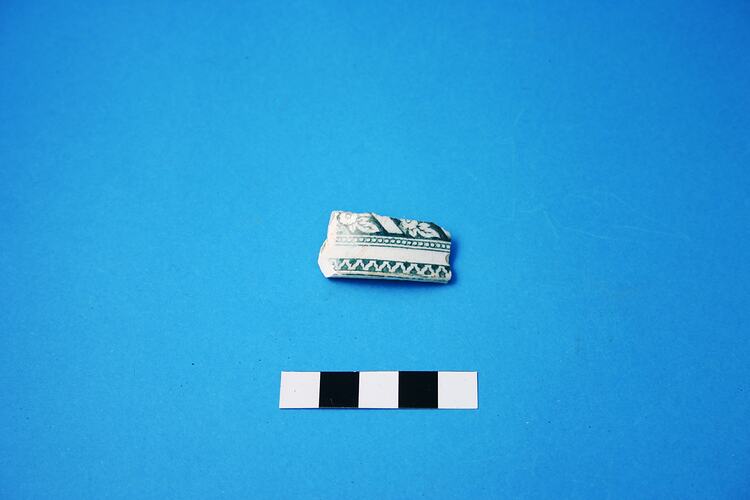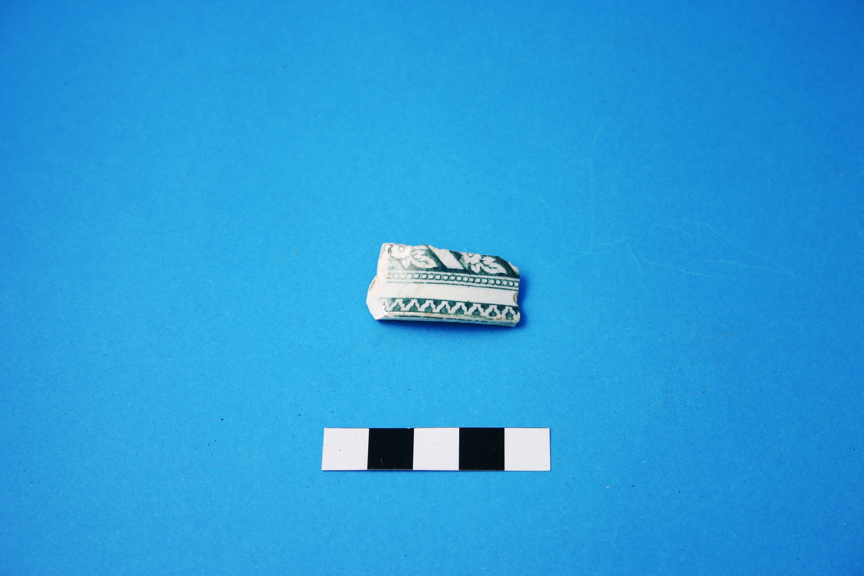 One earthenware cup rim fragment. Decoration is transfer print of an unidentified geometric pattern in green.