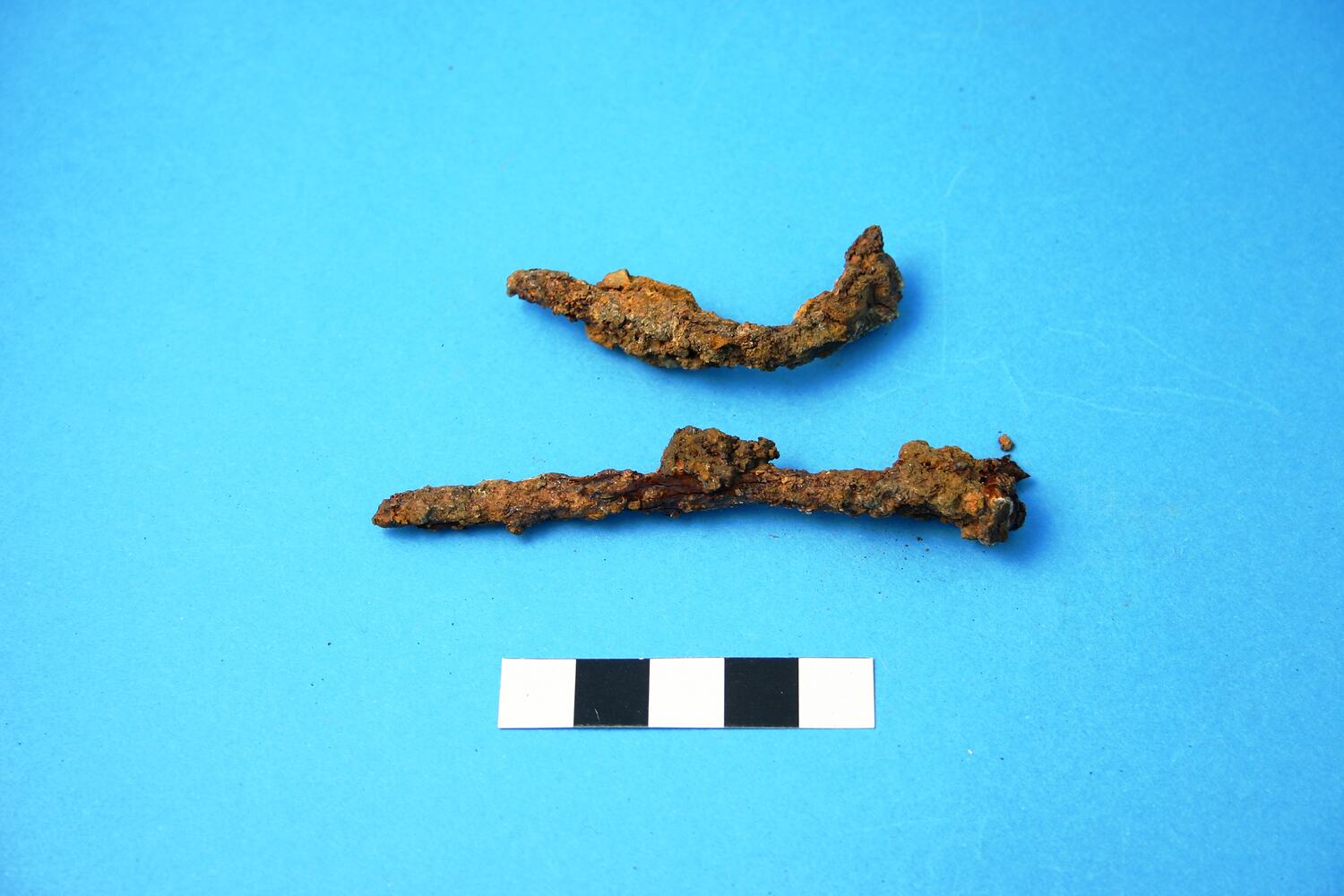 Two almost complete wire iron alloy nails. Head type cannot be determined due to rust and encrustation. Manufacturing period is from the 1850s.