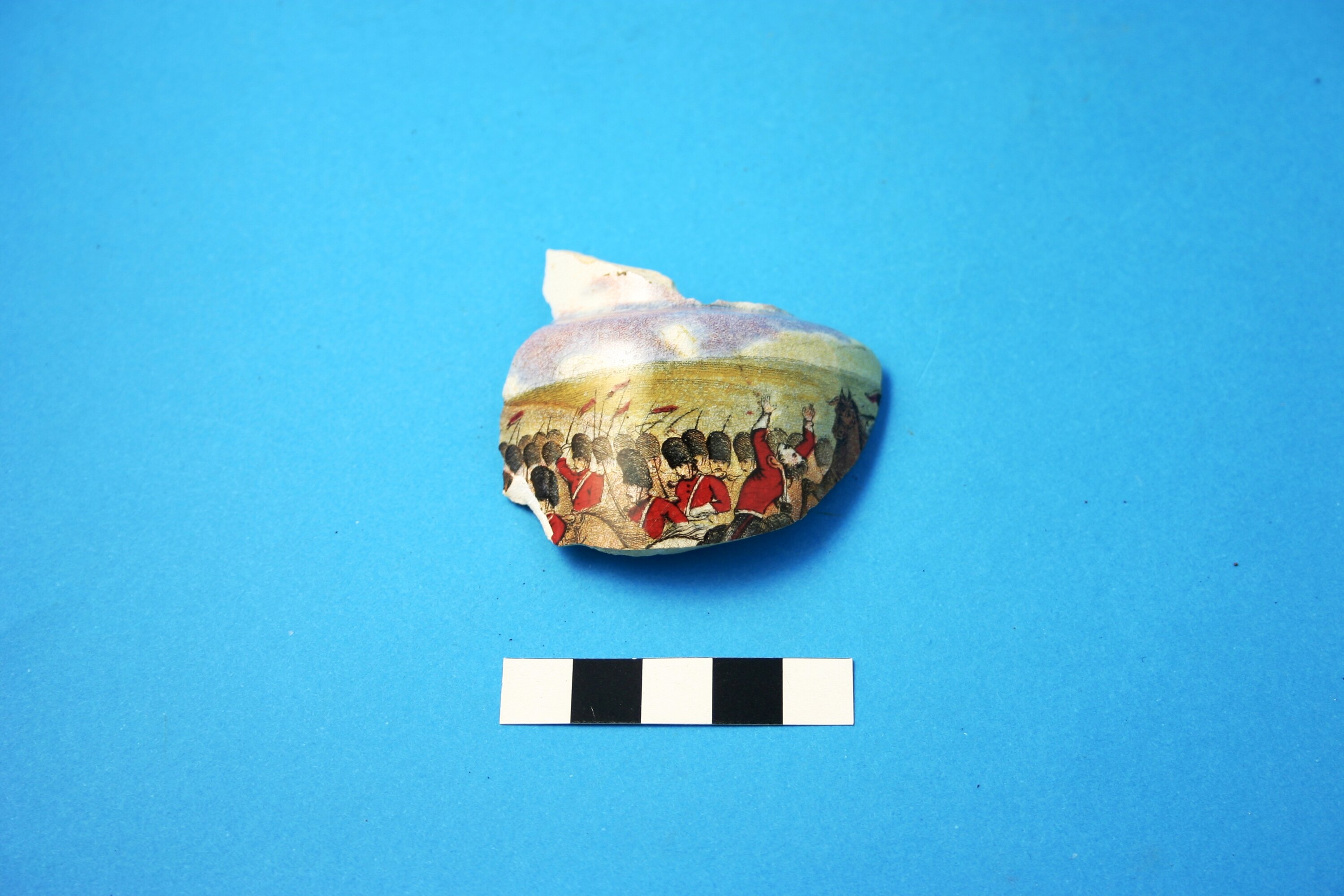 One fragment of a polychrome transfer printed condiment pot. The pattern is 'Charge of the Scots Greys at Balaklava', celebrating one of the battles of the Crimean War (1854-1856).
