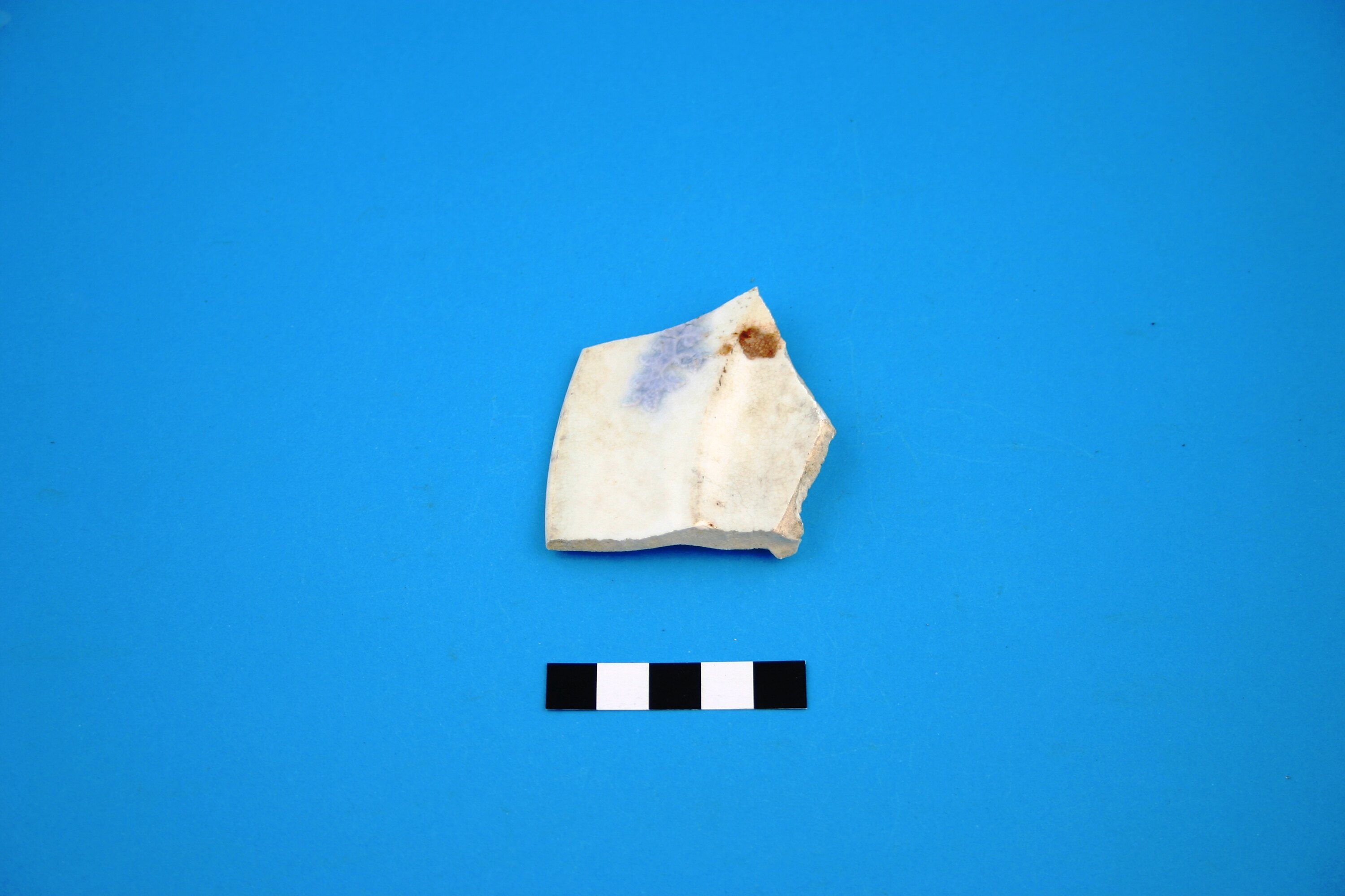 One porcelain plate rim fragment probably from a small plate. The decoration is light blue applied sprig in a grapevine pattern. The manufacture date range is circa 1820 to the late 19th century.