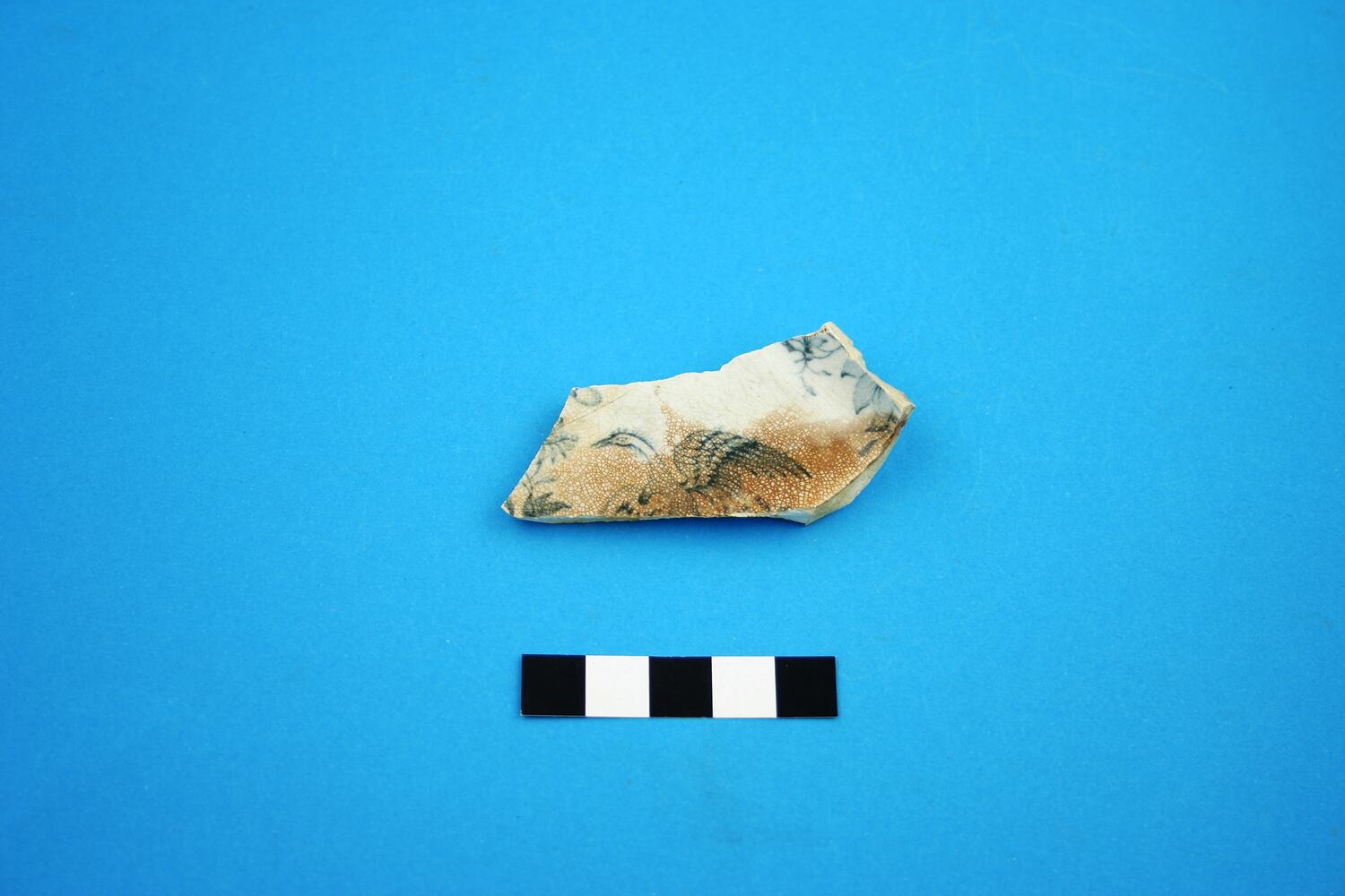 One earthenware plate base fragment. Transfer print is blue/grey 'Asiatic Pheasants', popular in the second half of the 19th century and into Edwardian times.