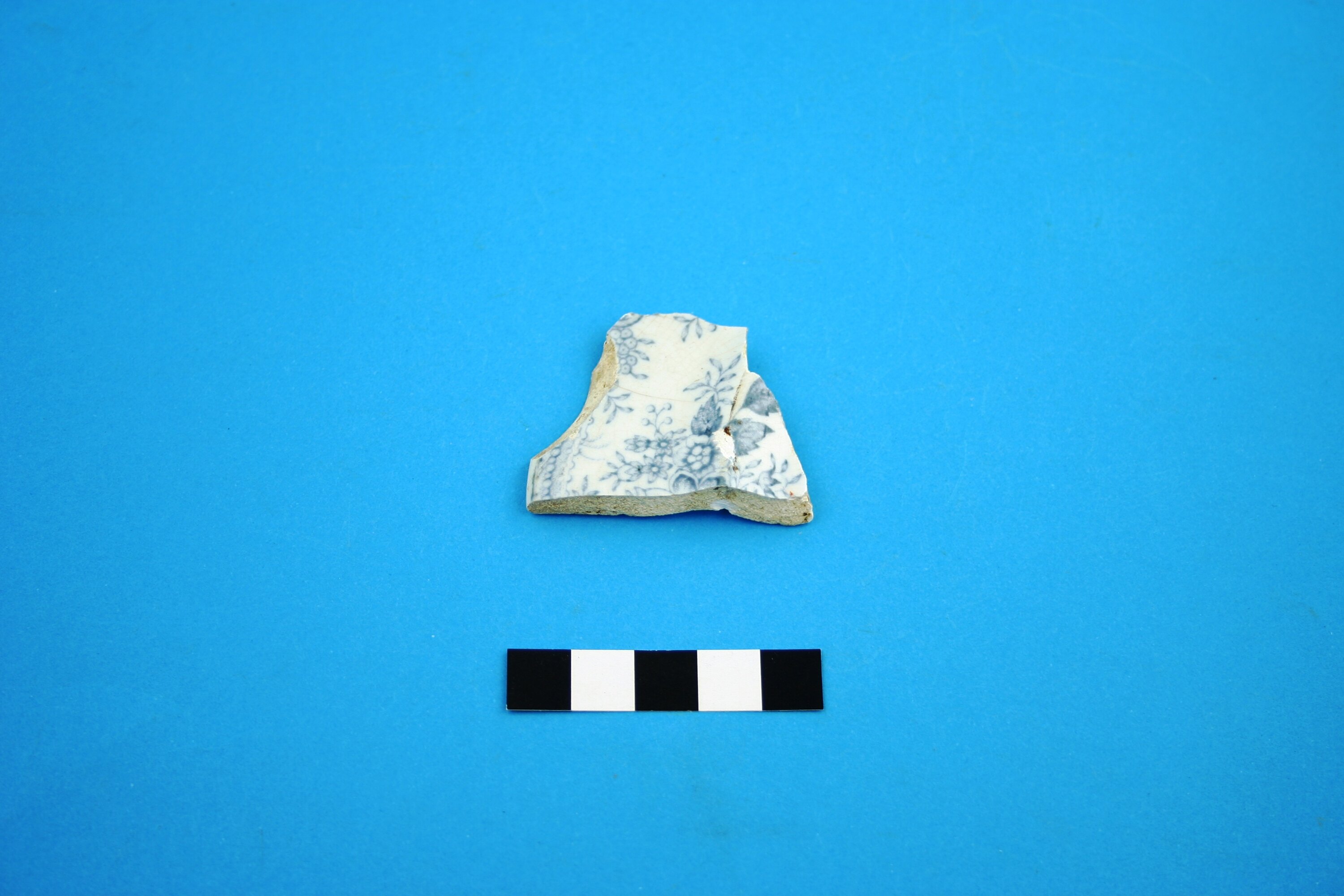 One earthenware plate base fragment. Transfer print is blue/grey 'Asiatic Pheasants', popular in the second half of the 19th century and into Edwardian times.