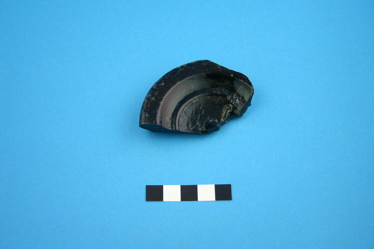 One dark green glass beer or wine bottle base fragment. Was manufactured in a vented mould with a separate base plate, suggesting it was made after circa 1874 but before circa 1900.