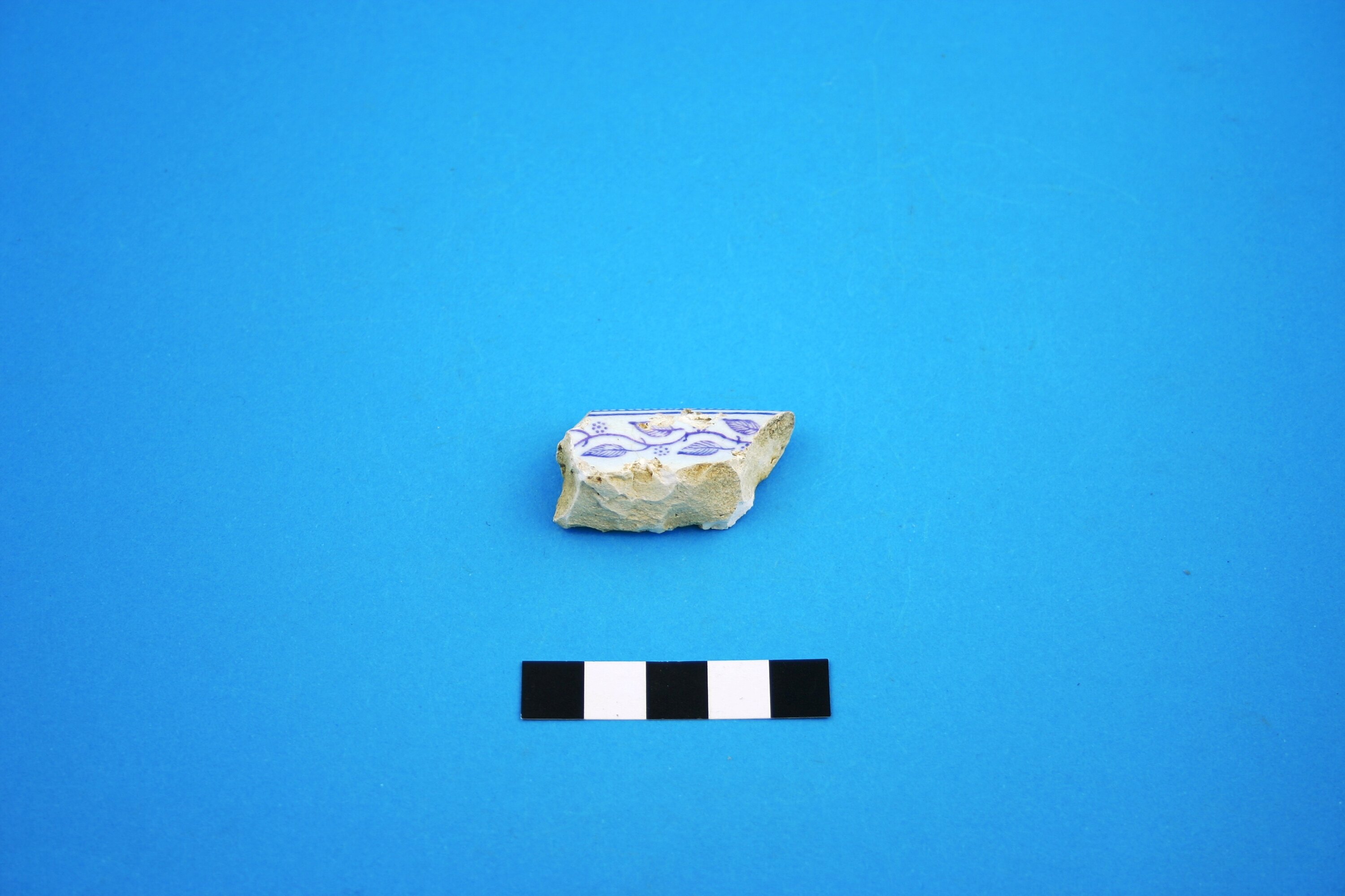One earthenware rim fragment possibly from a chamber pot. The decoration is a violet transfer print in an unidentified pattern. Manufacture date is circa 1814 to circa mid-20th century.