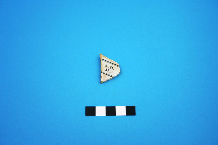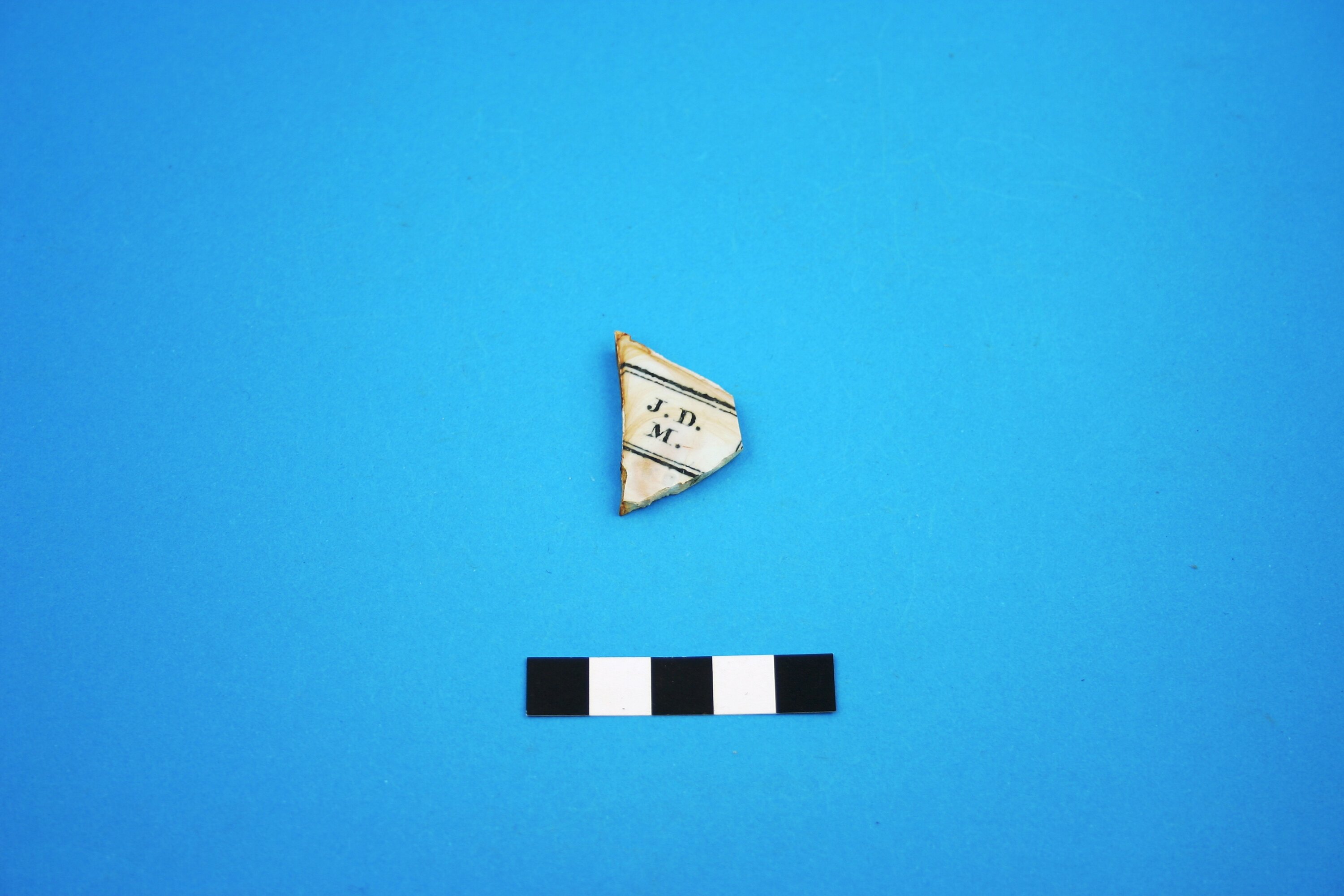 One white glazed fragment from an unidentified item. Maker's mark 'J D M'. Made after circa 1805.