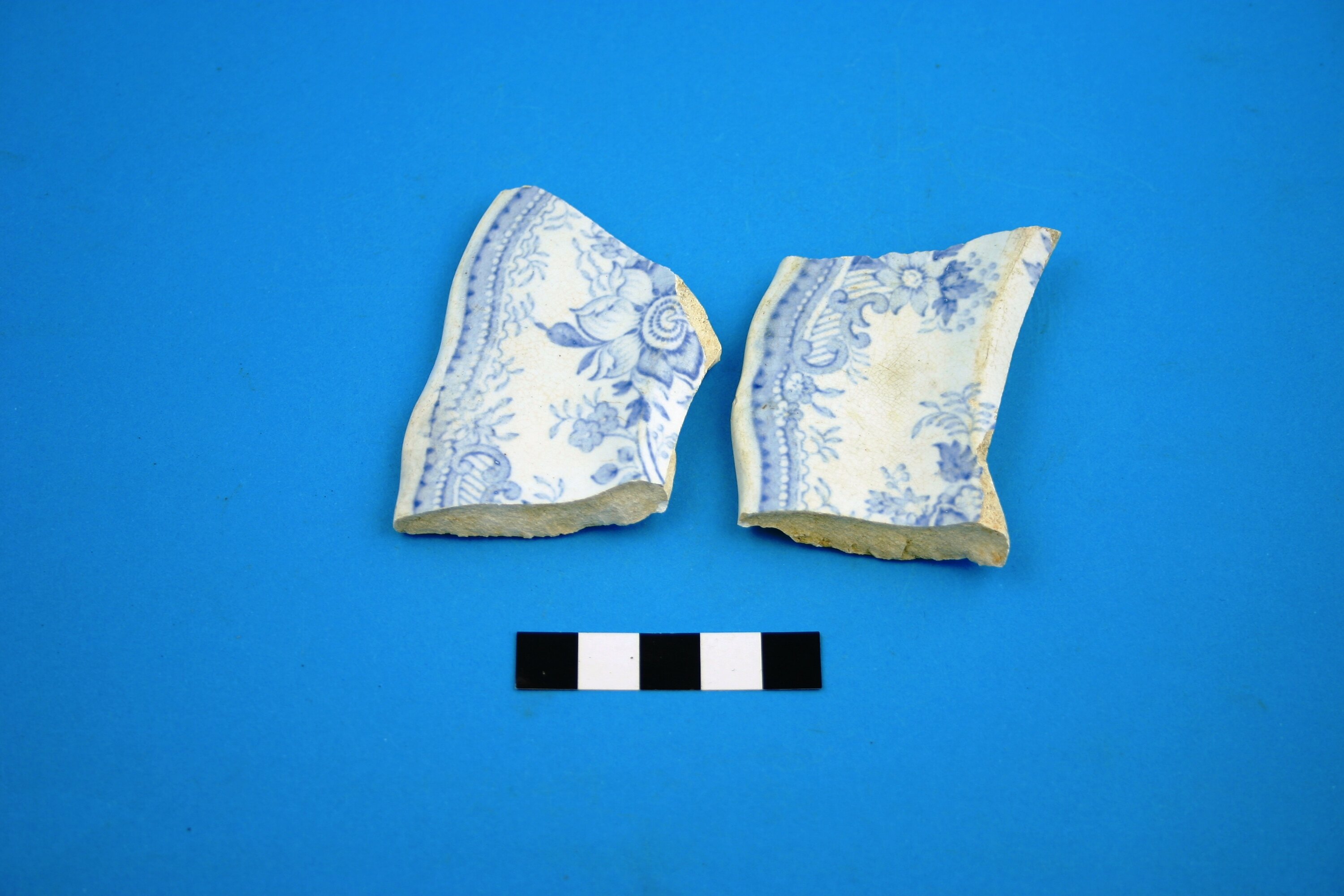 Two conjoining earthenware plate rim fragments. Transfer print is blue 'Asiatic Pheasants', popular in the second half of the 19th century and into Edwardian times.