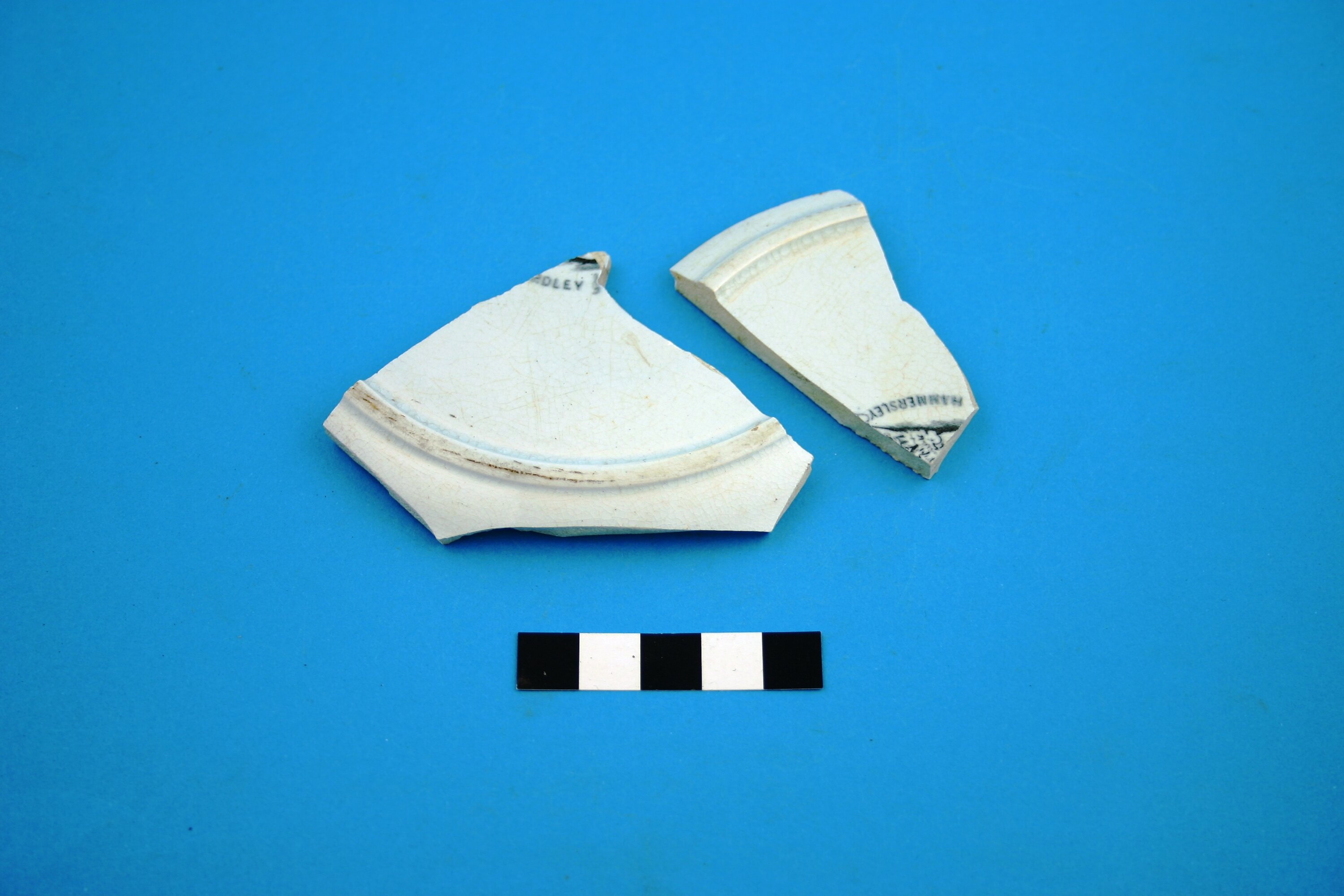 Two conjoining fragments of white glazed plate base. Maker's mark: '.RDLEY & HAMMESLEY'. Manufactured by Eardley and Hammersley of Staffordshire (1862 - 1866).