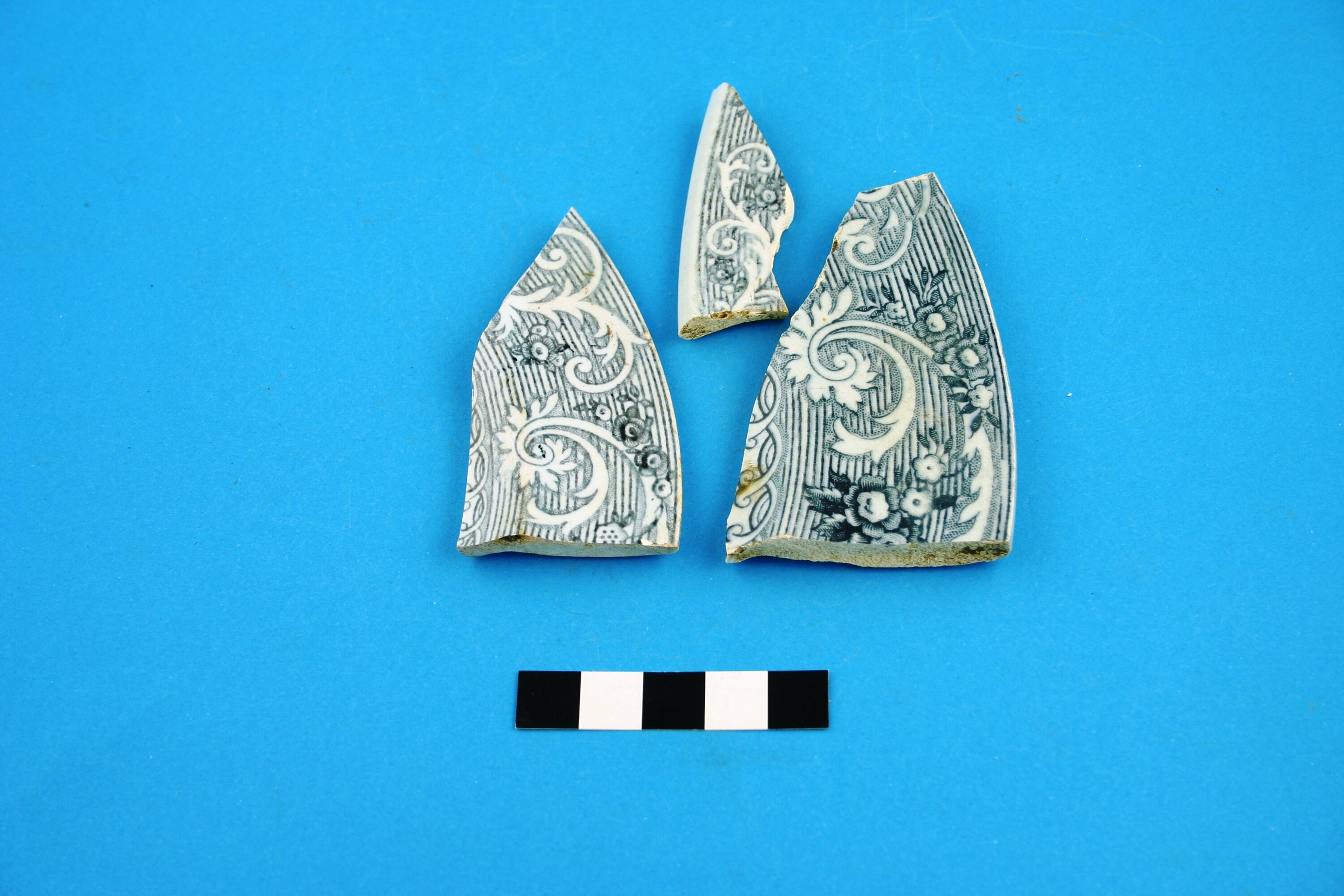 Three earthenware plate rim fragments. Transfer print is grey 'Rhine', probably manufactured in the latter part of the 19th century.