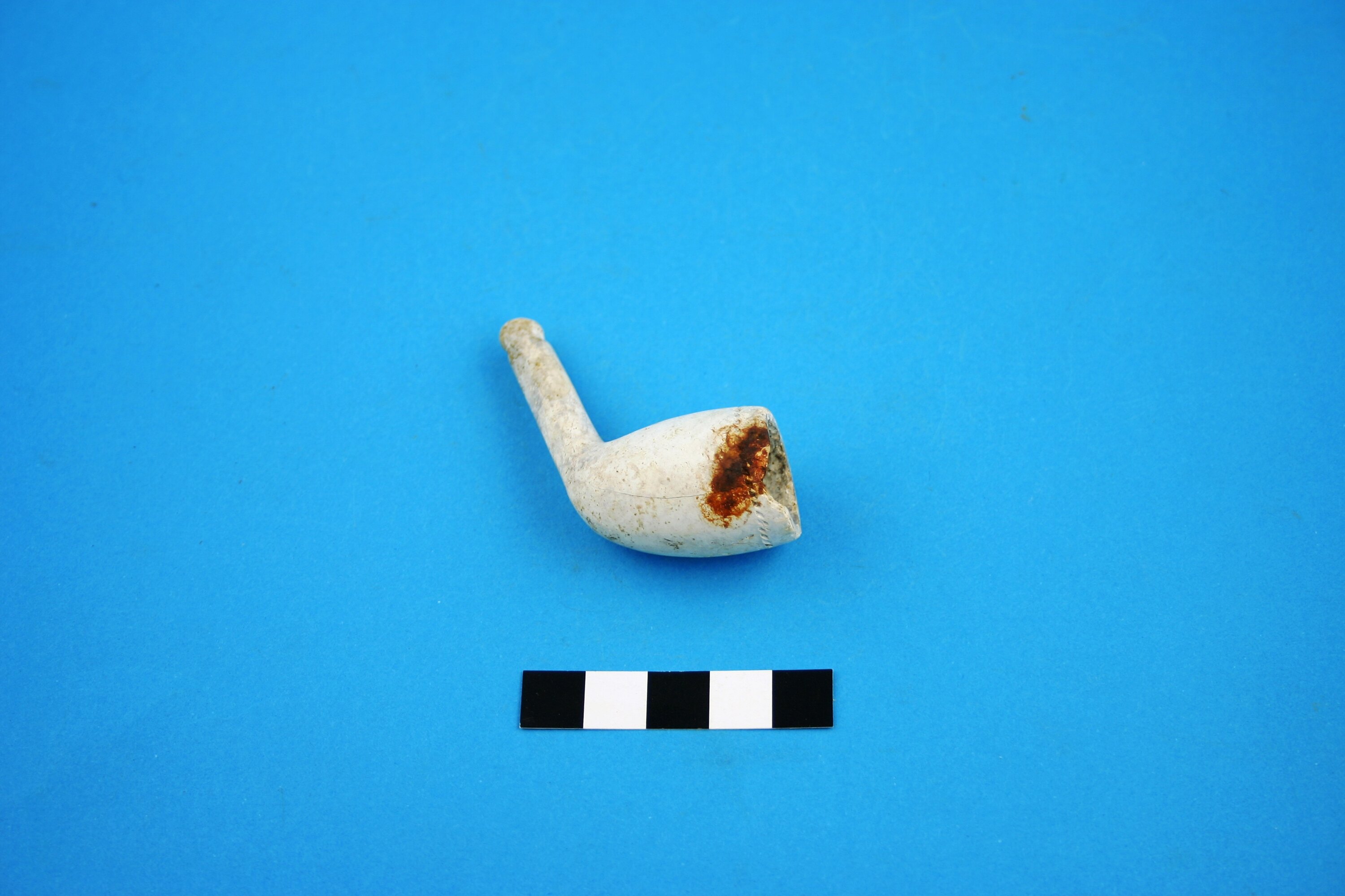 One bowl and partial stem of a clay pipe with an impressed decoration of a rilled edge and an Irish harp. The stem has been shortened/broken and then the pipe continued to be used, as evident by the teeth marks on the end.