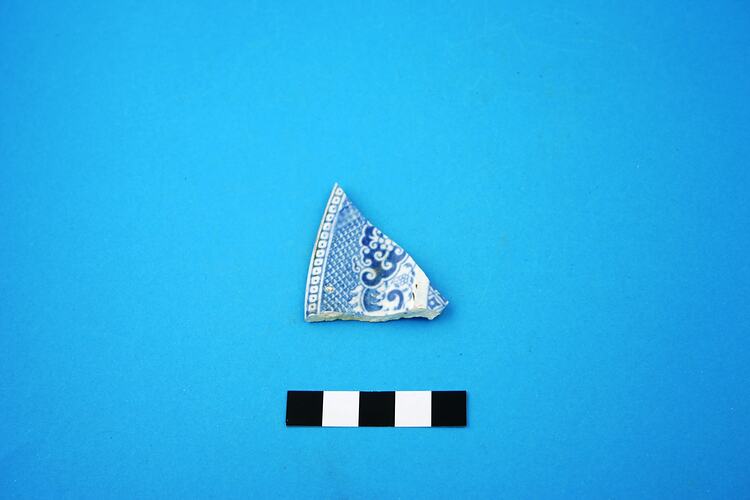 One earthenware plate rim fragment. Pattern is blue transfer print 'Willow'. Manufacturing date range is circa 1805 to circa 1900.