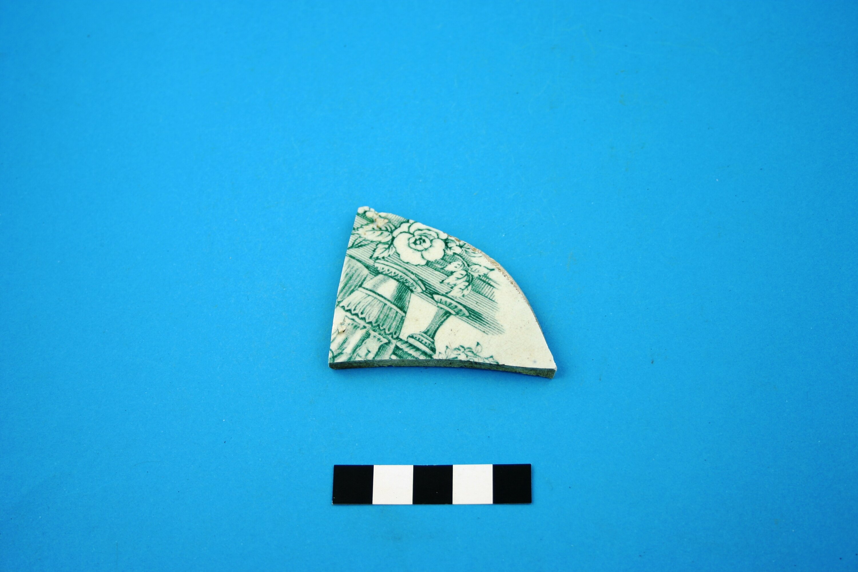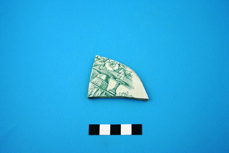 One earthenware base fragment probably from a plate. Decoration is transfer print of an unidentified pattern in green. Has a partial registration mark that is post-1868 style (does not include year letter) and small fragment of maker's mark. Manufactured after circa 1868.