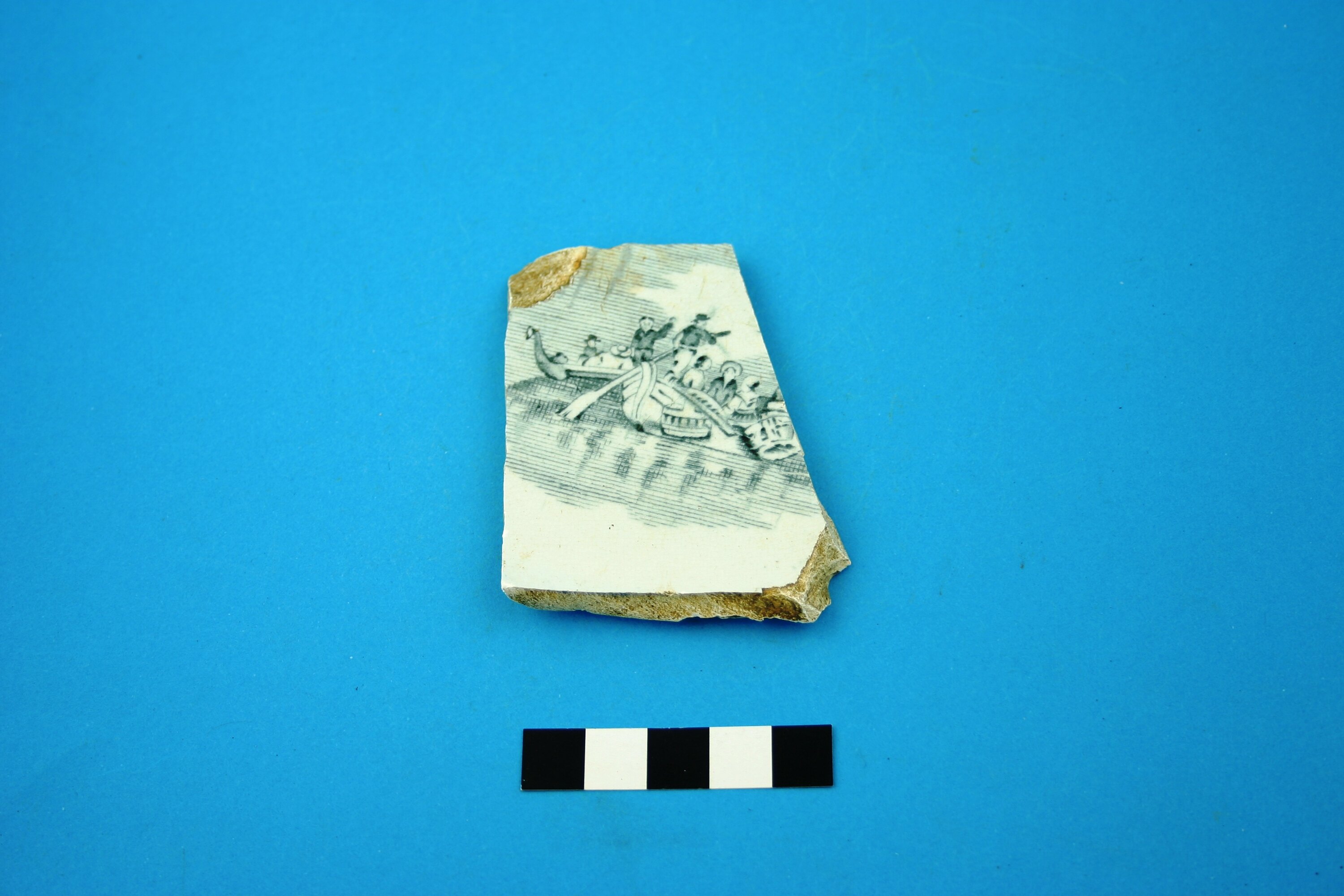 One earthenware plate base fragment. Transfer print is grey 'Rhine', probably manufactured in the latter part of the 19th century.