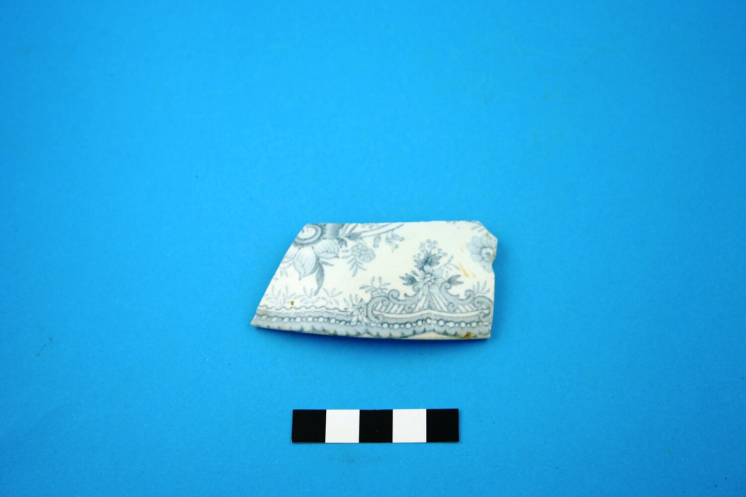One earthenware rim fragment from an unidentified item. Transfer print is blue/grey 'Asiatic Pheasants', popular in the second half of the 19th century and into Edwardian times.