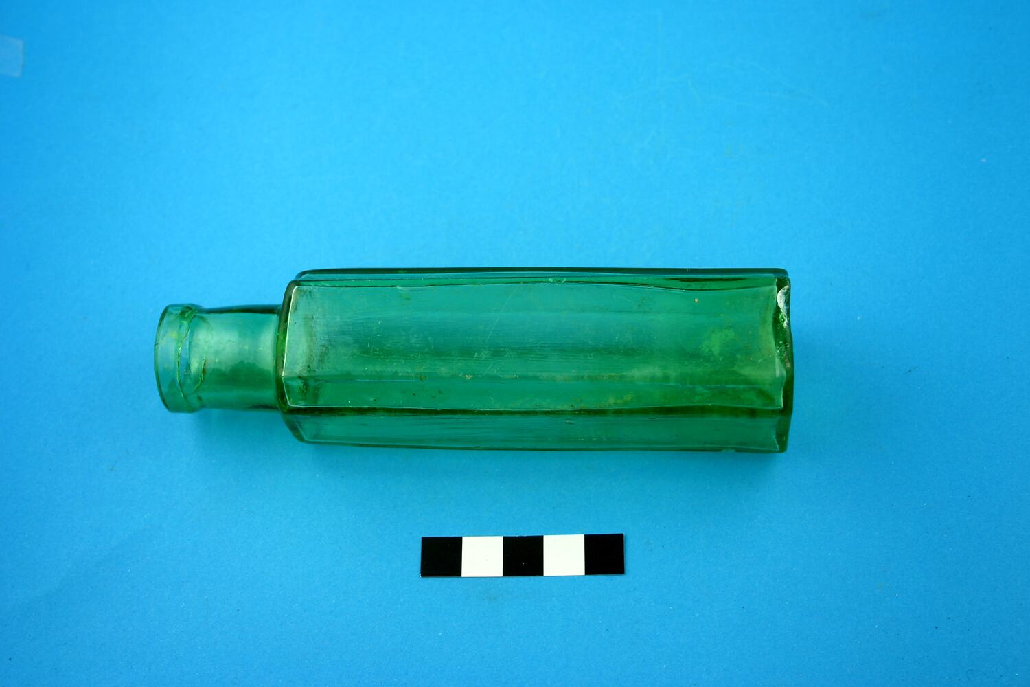 One complete green glass bottle. The body shape is square with chamfered corners. Has been manufactured in a 2-piece mould that had a separate base plate. Broad manufacture date range of mid-19th century to circa 1900.
