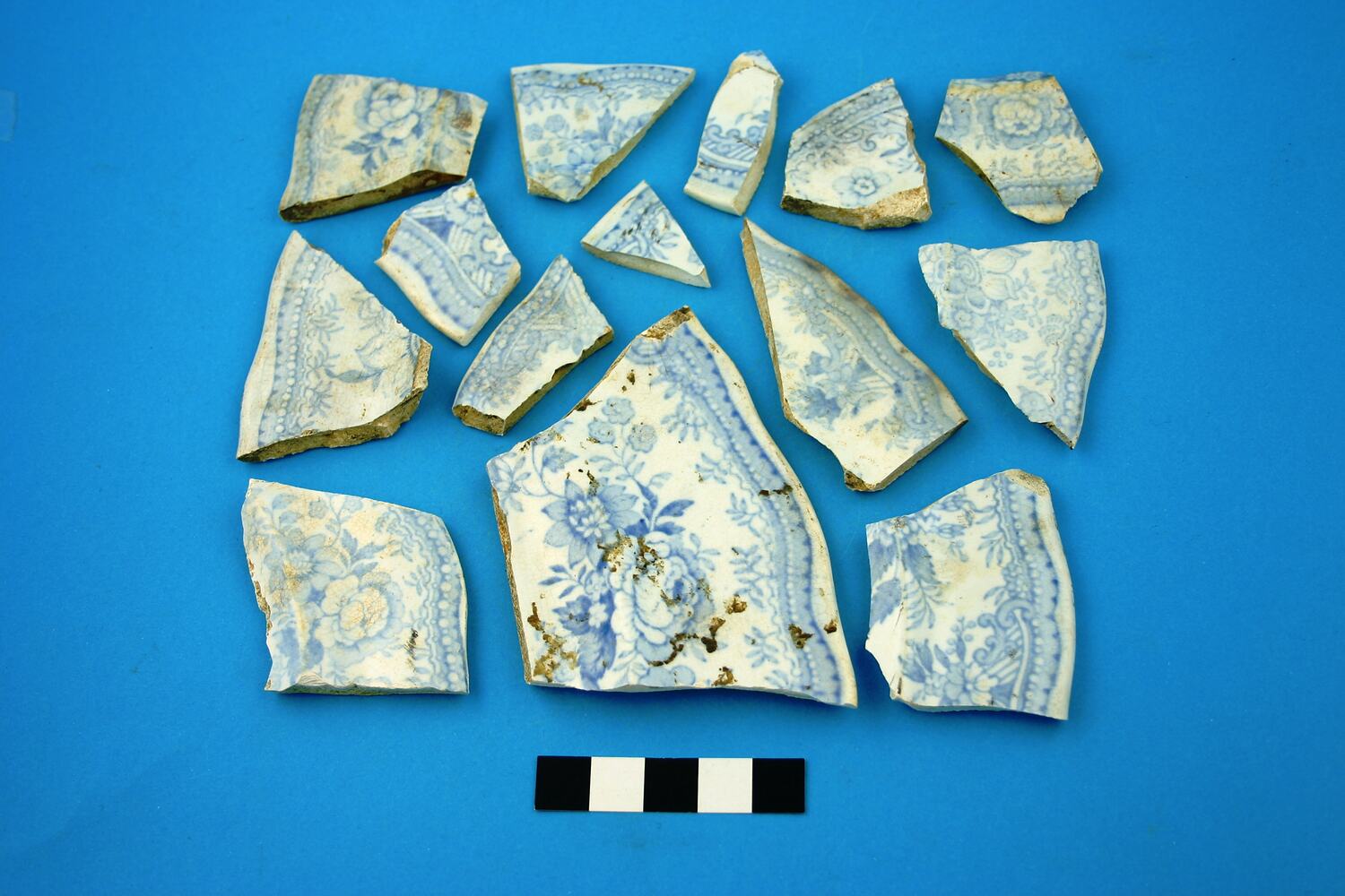 Fourteen earthenware plate rim fragments. Transfer print is blue 'Asiatic Pheasants', popular in the second half of the 19th century and into Edwardian times.