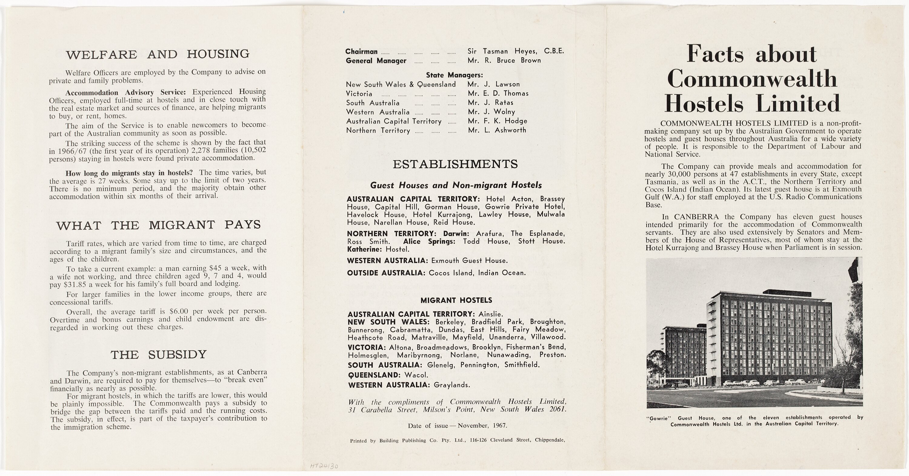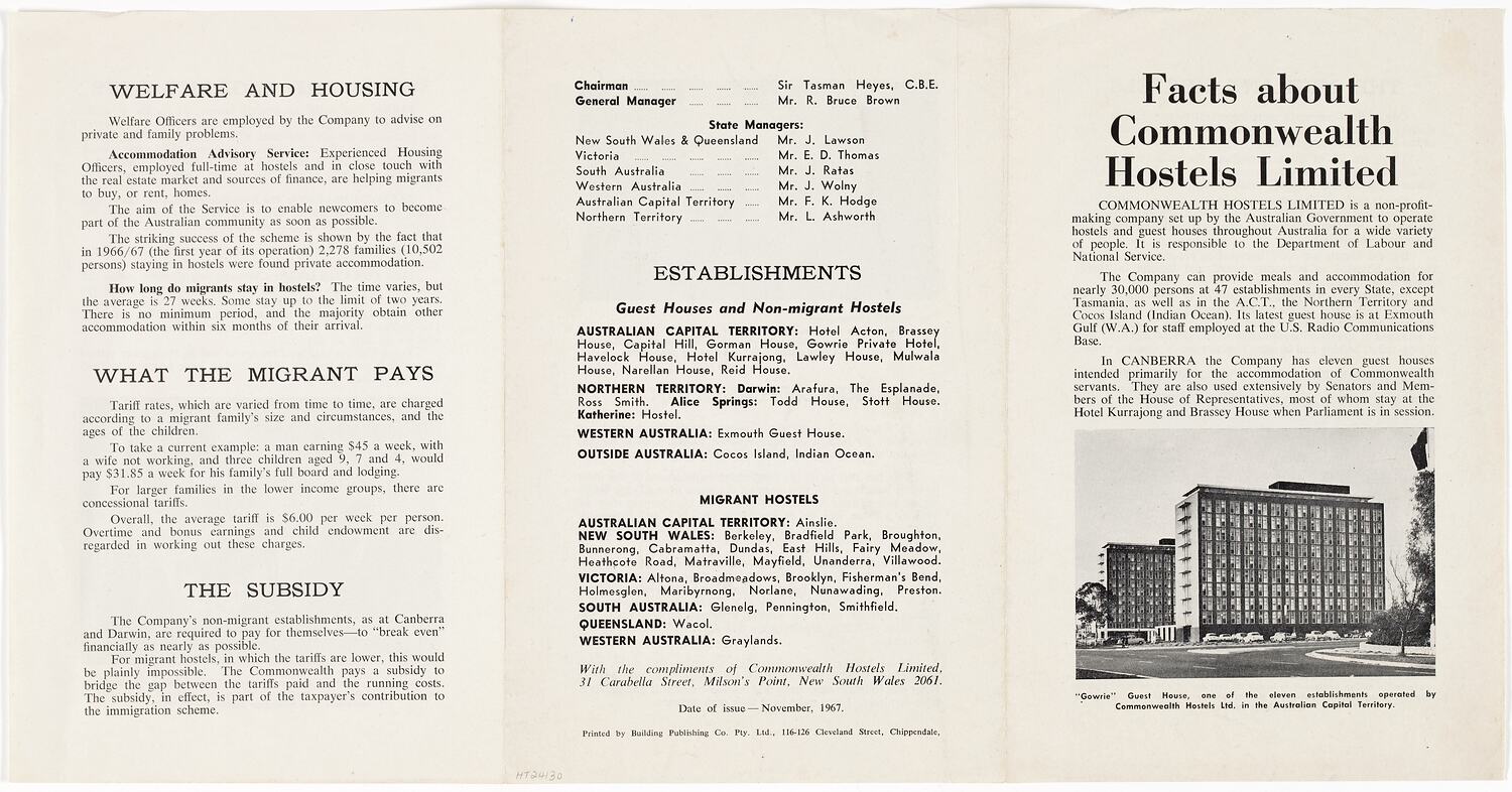 Booklet 'Facts about Commonwealth Hostels Limited' published by Commonwealth Hostels Ltd, 1967. The booklet has information about: the company's role in Australian the migrant hostels, the various the facilities and services provided by them, information about the hostel reconstruction programme, which began in 1965, and a description of the guest houses and non-migrant hostels also operated by the company. The list on the last page of the booklet indicates that in 1967 there were 28 migrant hostels and 20 guest houses and non-migrant hostels managed by Commonwealth Hostels Ltd.