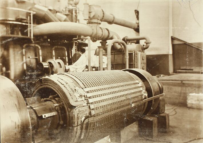 Rotor of no.4 Parsons-Brush turbo-alternator set under repair at the Melbourne Electric Supply Comapny's, Green Street Power Station, Richmond, Victoria, 27th December 1910.