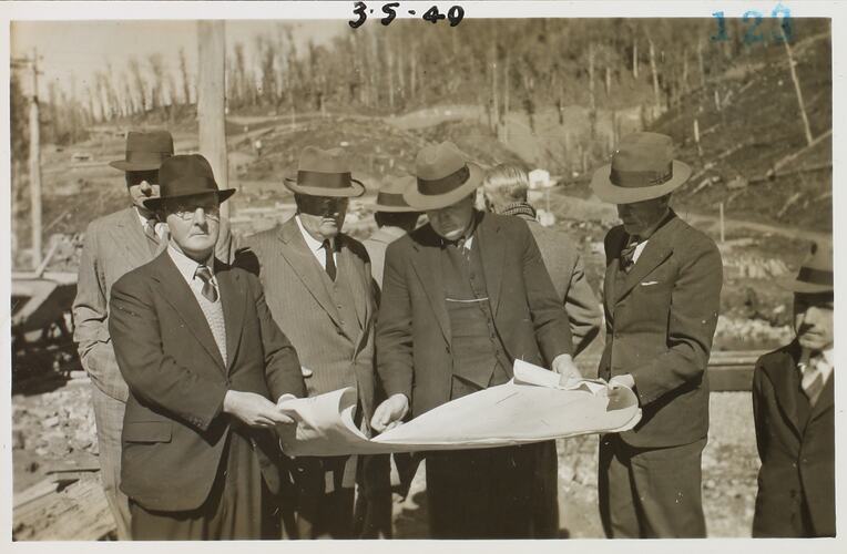 Group of four suited men looking over building plans in centre of image, maybe inspectors or official party, bushland in background, some trees showing regrowth following bushfire, Victoria, 1940