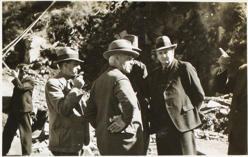 Group of four men in centre of image facing eachother in suits and hats, one man to the left in background and one to the right in foreground, bushland in background, Victoria, May 1940.