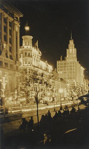 Monochrome photograph depicting an illuminated buildings in Melbourne on Swanston Street as part of the 1934 Centenary celebrations. It is part of a large photographic collection of glass plate and film negatives, photographic prints and photo albums, relating to the development of the electric power supply industry in Victoria, operated by the State Electricity Commission of Victoria (SECV) from 1919 to 1993 and various predecessor private and municipal power supply enterprises dating back to the late 1880s.