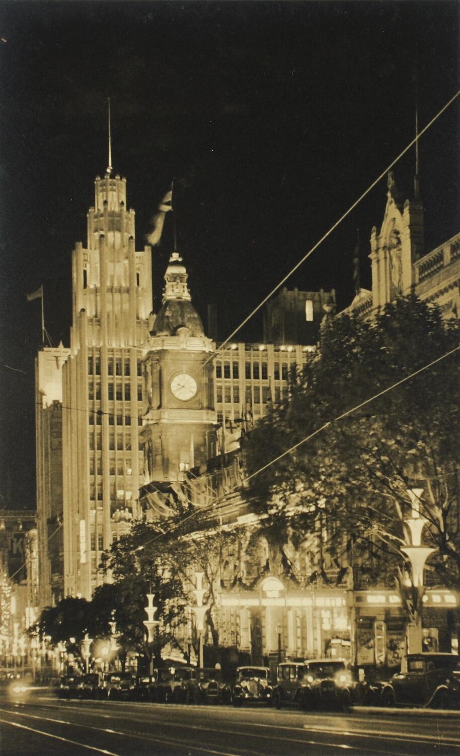 Monochrome photograph depicting illuminated buildings in Melbourne on Collins Street as part of the 1934 Centenary celebrations. It is part of a large photographic collection of glass plate and film negatives, photographic prints and photo albums, relating to the development of the electric power supply industry in Victoria, operated by the State Electricity Commission of Victoria (SECV) from 1919 to 1993 and various predecessor private and municipal power supply enterprises dating back to the late 1880s.