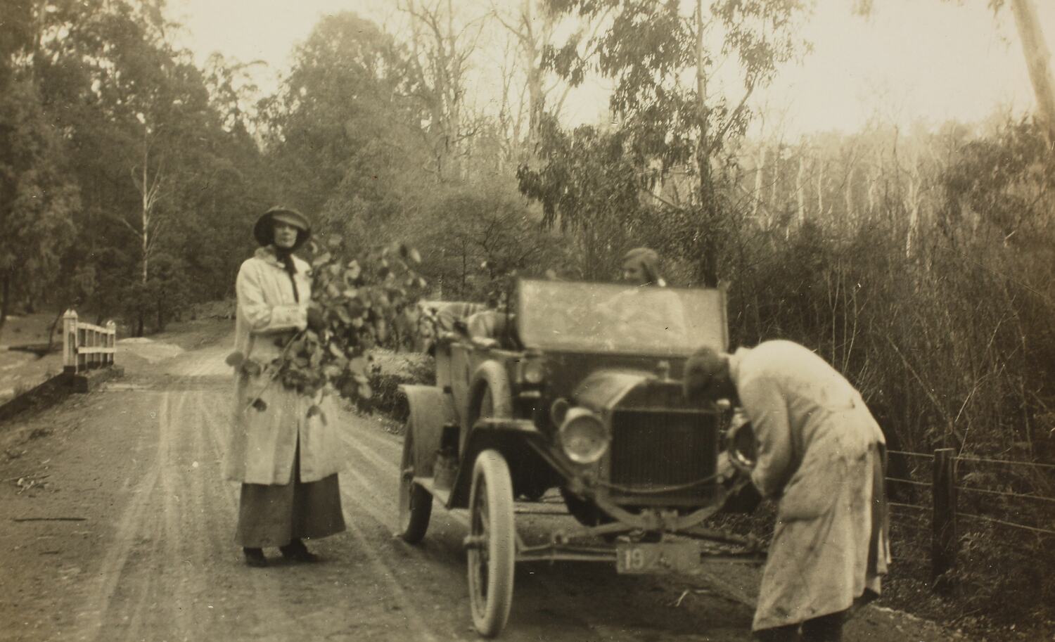 Model T Ford Motor car on a dirt road surrounded by bushland, with two women and one man. One woman is sitting in car, the other holds tree branches and is standing on the road. The man is attending to something at the front of the vehicle. A bridge is pictured in the background.