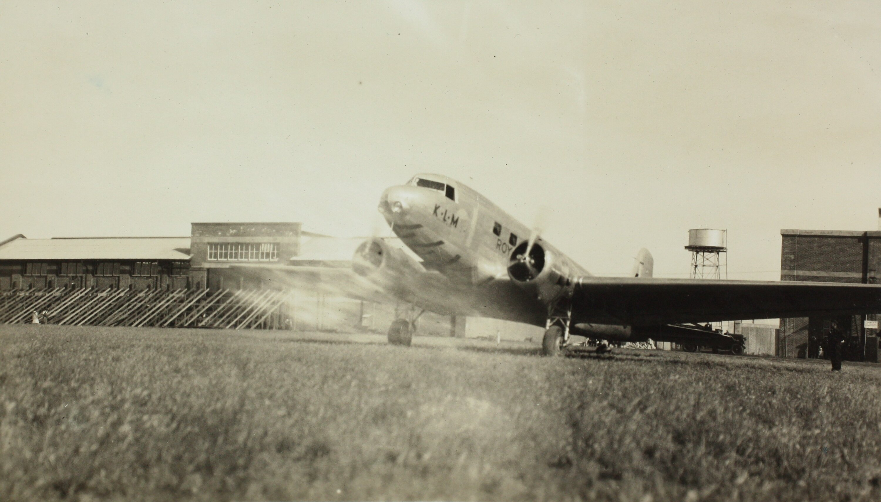 K.L.M. Royal Dutch Airlines, aeroplane on ground with propellers in motion. Buildings pictured in the background. This KLM DC-2 'Uiver' aeroplane competed in the 1934 MacRobertson Centenary Air Race from England to Australia.
