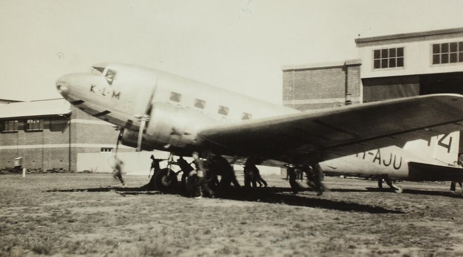 K.L.M. Royal Dutch Airline DC-2 aeroplane showing a group of men pulling the aircraft from a hangar. Buildings at Laverton RAAF Base are pictured in the background. This KLM DC-2 named 'Uiver' (Stork) aeroplane competed in the 1934 MacRobertson Melbourne Centenary Air Race from England to Australia. It came second in the speed section of the race and won the handicap section.
