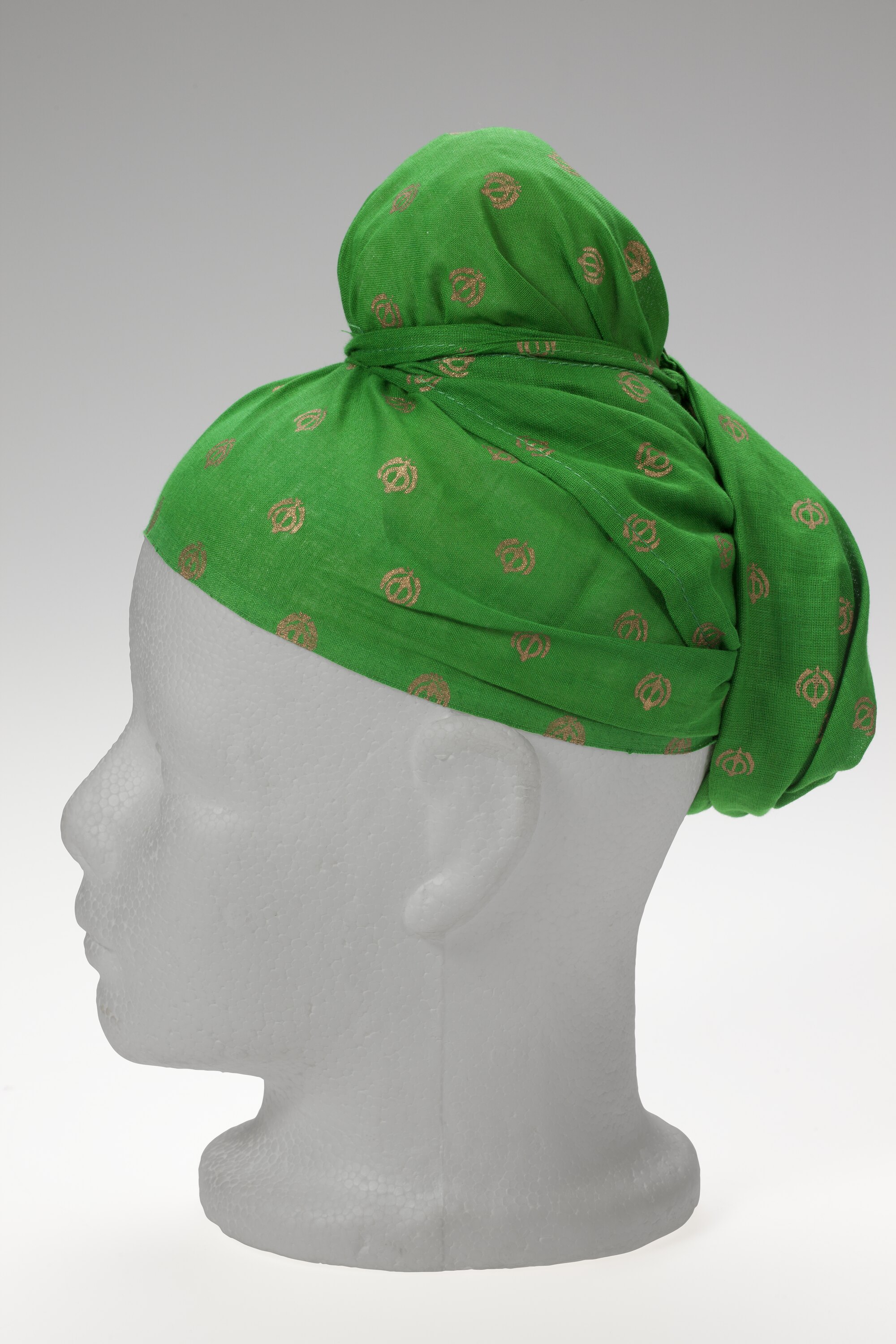 Square cloth with a green background and gold Khanda pattern called a patka used by Arvi or Ronnie circa 2010. The patka is a Sikh head covering which is worn by Sikh children who are not ready to wear tubans. Sometime during their teenage years, Sikh children take part in the dastaar bandhi ceremony where they tie a turban for the first time and affirm their identity as Sikhs. Thereafter, they wear the turban.The patka can also be worn by adult Sikhs as an under-turban and when playing sport.