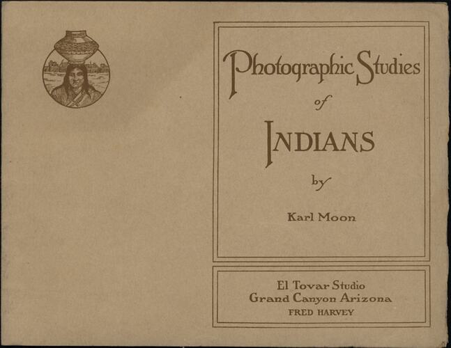 'Photographic Studies of Indians by Karl Moon' was issued by El Tover Studio and Fred Harvey, in Arizona, U.S.A. in 1910. It shows a collection of photographs by Karl Moon taken of Native Americans from a number of tribes including the Navaho, Hopi, Apache, Zuni, Taos, Santo Dominigo, Isleta, Laguna, Santa Clara, San Felipe, and Acoma tribes.