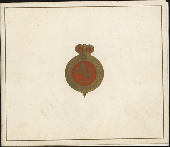 Bookle with off white cover featuring red and gold lion logo.