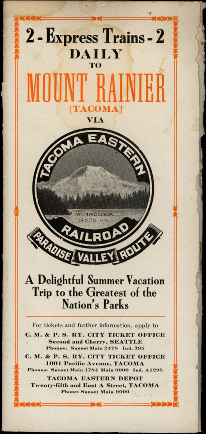 'Tacoma Eastern Railroad', a booklet issued by Tacoma Eastern Railroad in Washington, U.S.A. in 1911, provides travel information about the journey from Tacoma to The National Park Inn, Narada Falls and Paradise Valley.